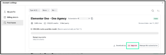 Locate Your Elementor One subscription. To upgrade and add more credits, click the Upgrade button next to the subscription details.