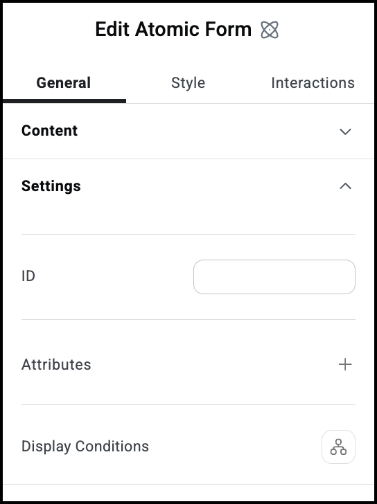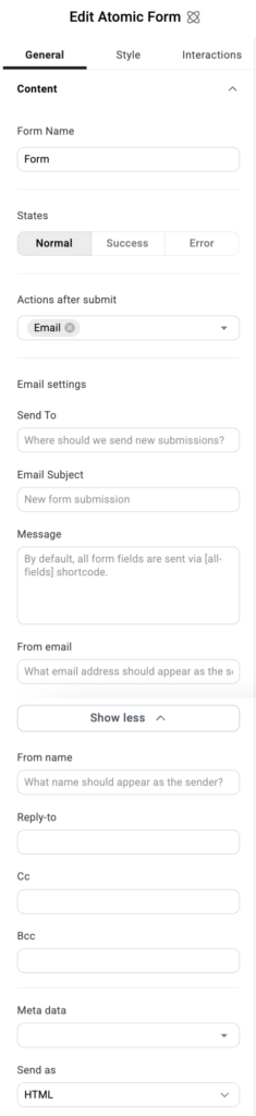 The settings for the Atomic Forms element focus on what happens when a visitor submits a form. The atoms that make up the form have their own settings which are detailed below.