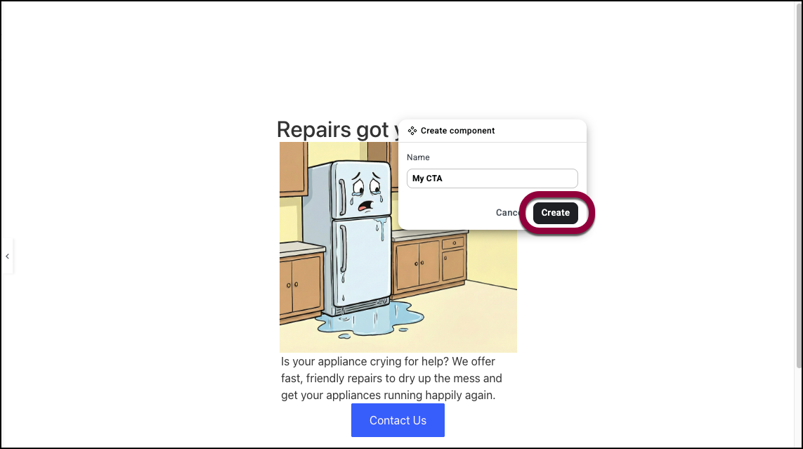 After clicking Create, you enter edit mode. The rest of your page dims with a darker overlay, focusing your attention on the component you’re building. This indicates you’re now working on the component’s master.