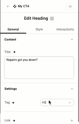 3. Edit a component’s setting(s). In the example below, we’ll change the Typography of the heading.