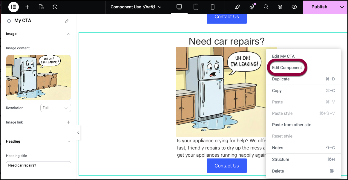 Unlike templates (which don’t sync after placement) or global widgets (which are limited to single widgets), Components let you create custom layout blocks – like CTAs, banners, testimonials, or feature sections – with the flexibility to customize specific content on each instance.