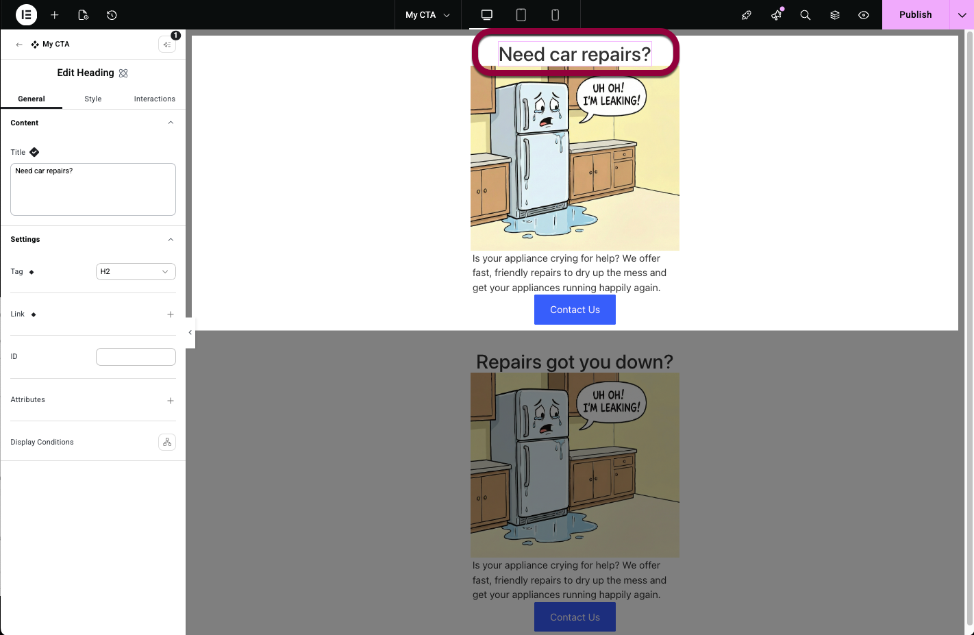 1. Use several V4 elements to create a design. In this example, we created a Call to action with a heading, image, paragraph and button element.
