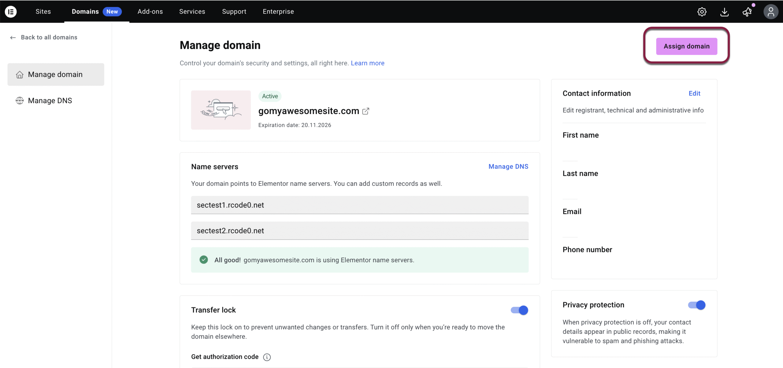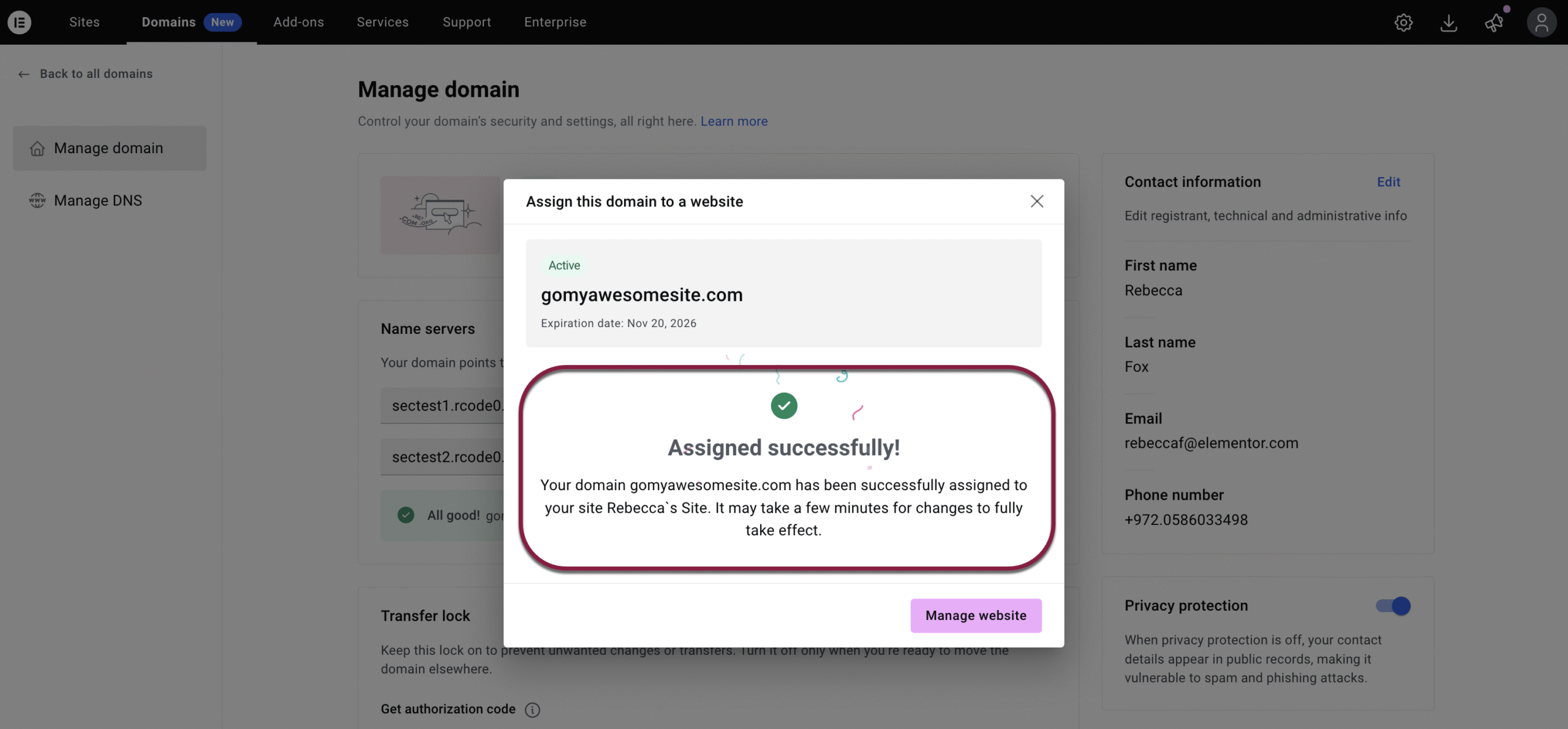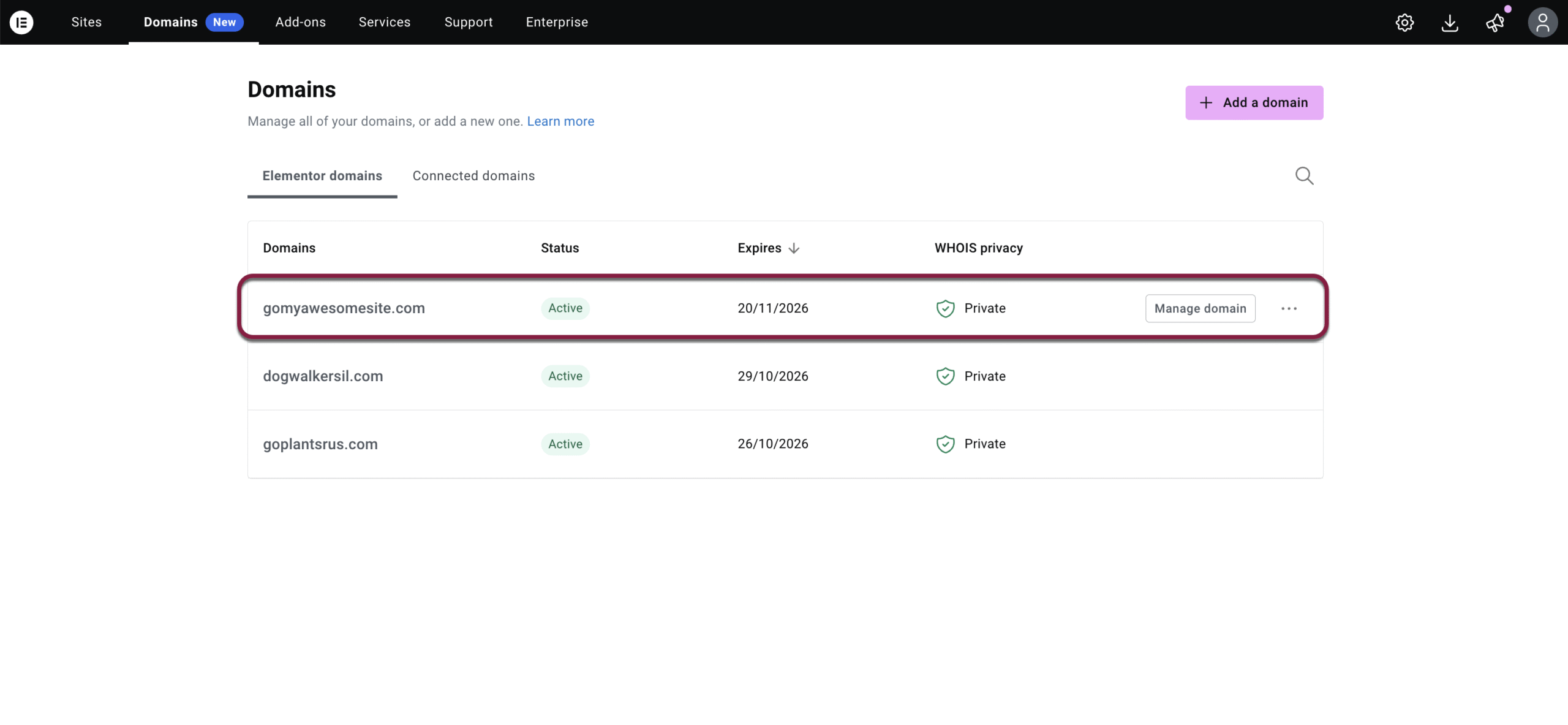 After purchasing or adding a domain, you can connect it to your Elementor site:
