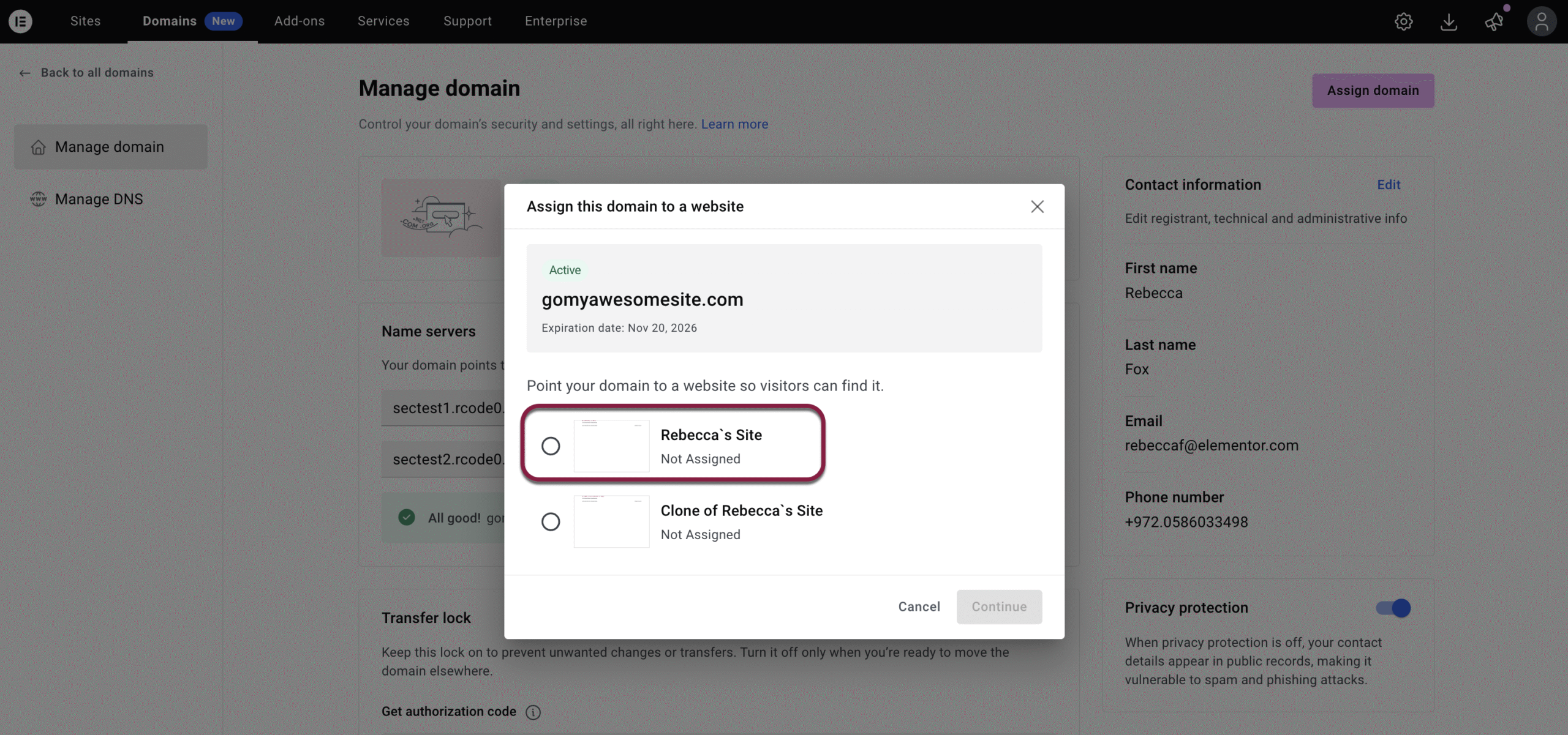 3. In the window that appears, choose the site where you’d like to assign the domain and click Continue.