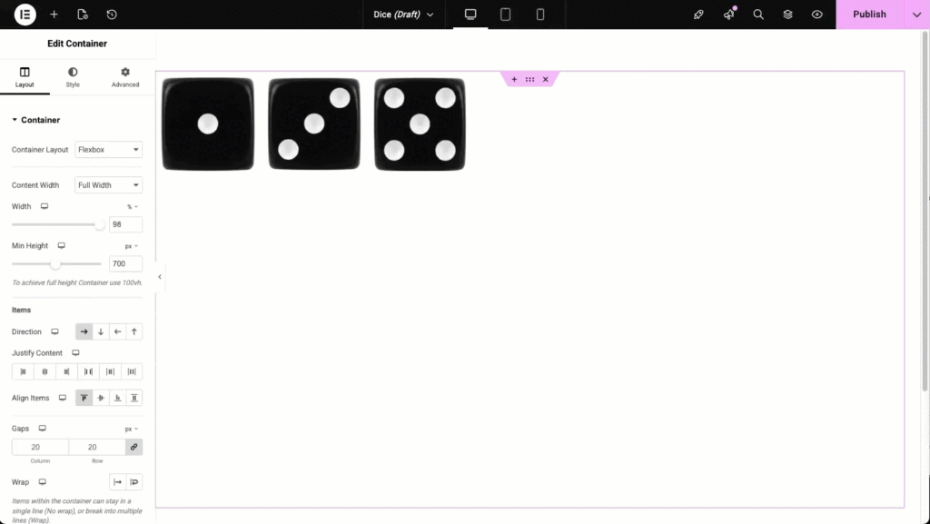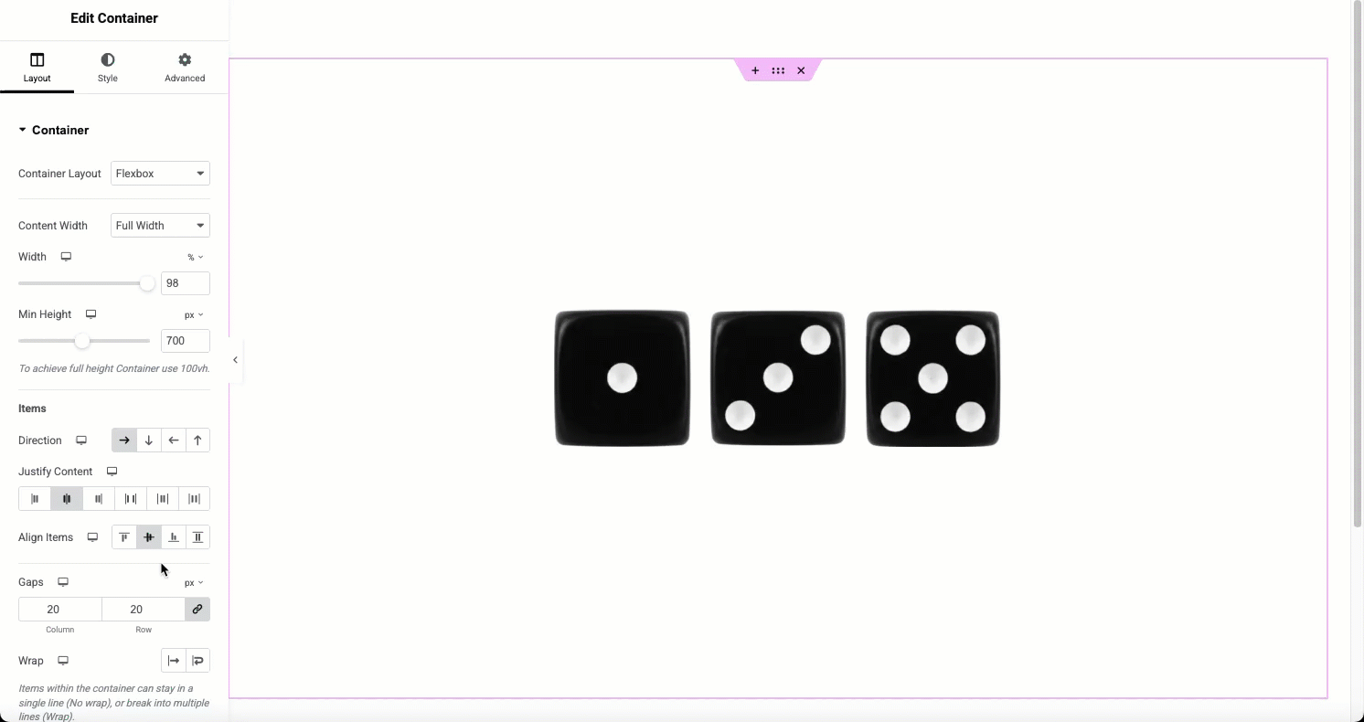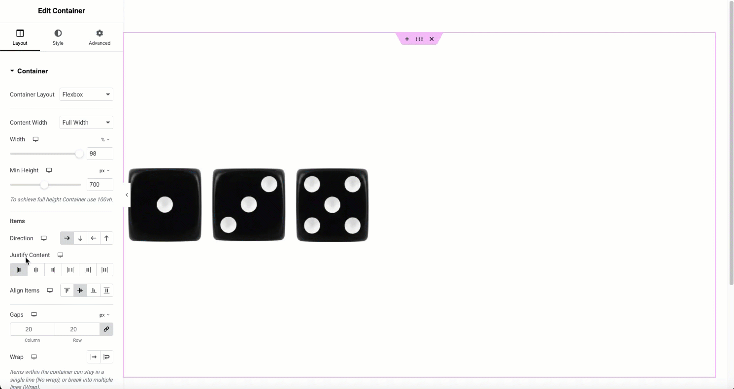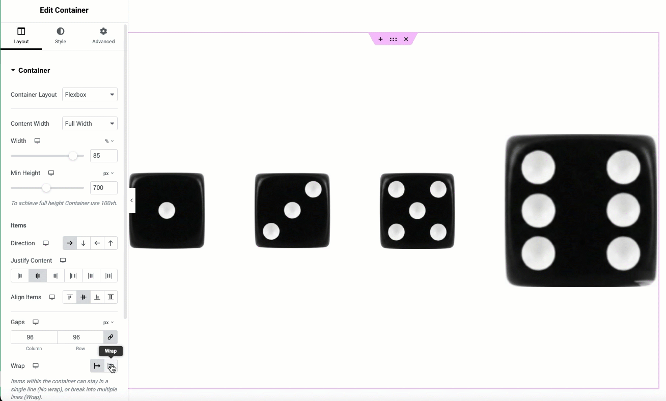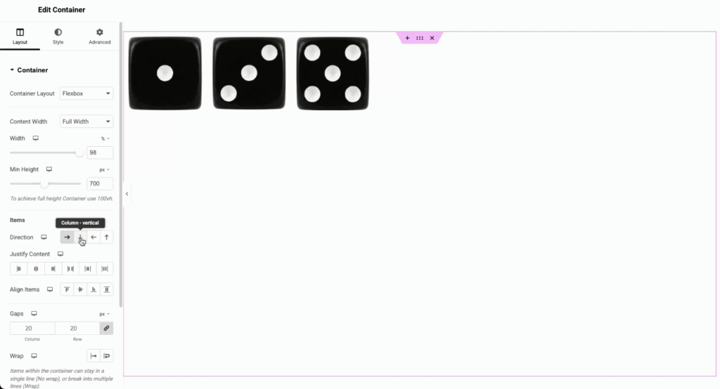 The direction option is the most basic, but also most important of container layout options. Choose between Row, Column, or the Reversed options depending on your needs and layout.