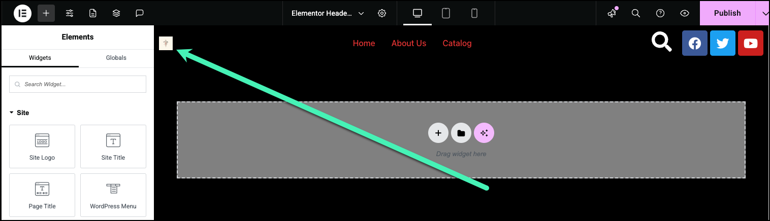 - Add the Site Logo widget to the container to the left of the menu. Adjust the size to suit your design. For details, see Site Logo widget.