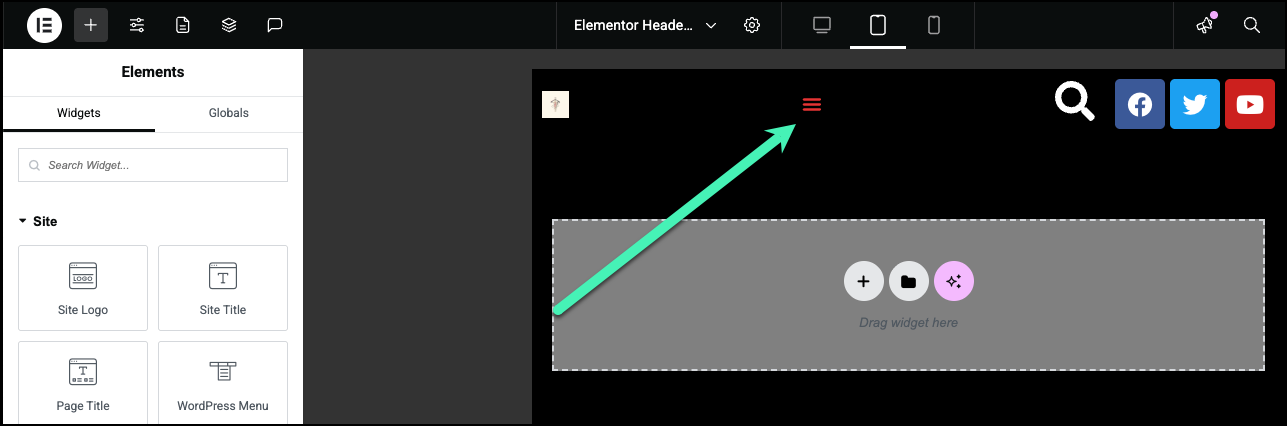 Notice that the menu icon is replaced by a hamburger icon. This icon is controlled by the settings of the menu widget. - Click the mobile icon to see how the header will look on mobile devices.