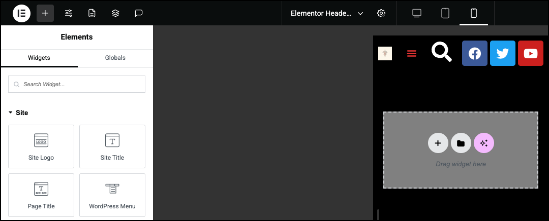 The header is a good place to add a search function. While there’s plenty of space in the header to add a search widget for people visiting the site from a PC, it will be too big for mobile devices. Instead, we’ll add a search icon to the header and users clicking the icon will open up a search screen. For details, see Off-Canvas widget. - Click the plus sign in the top bar.