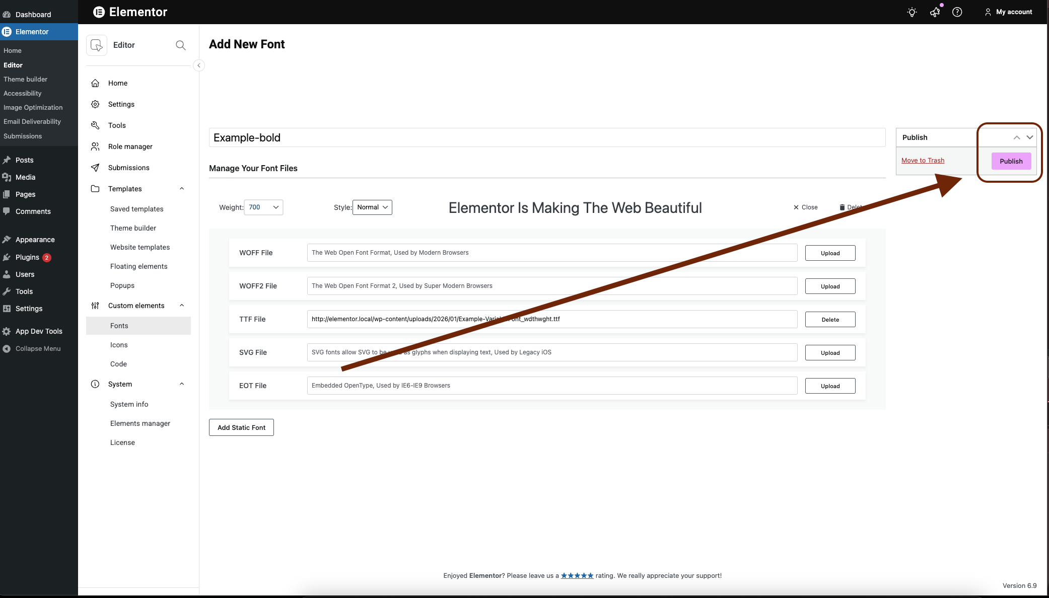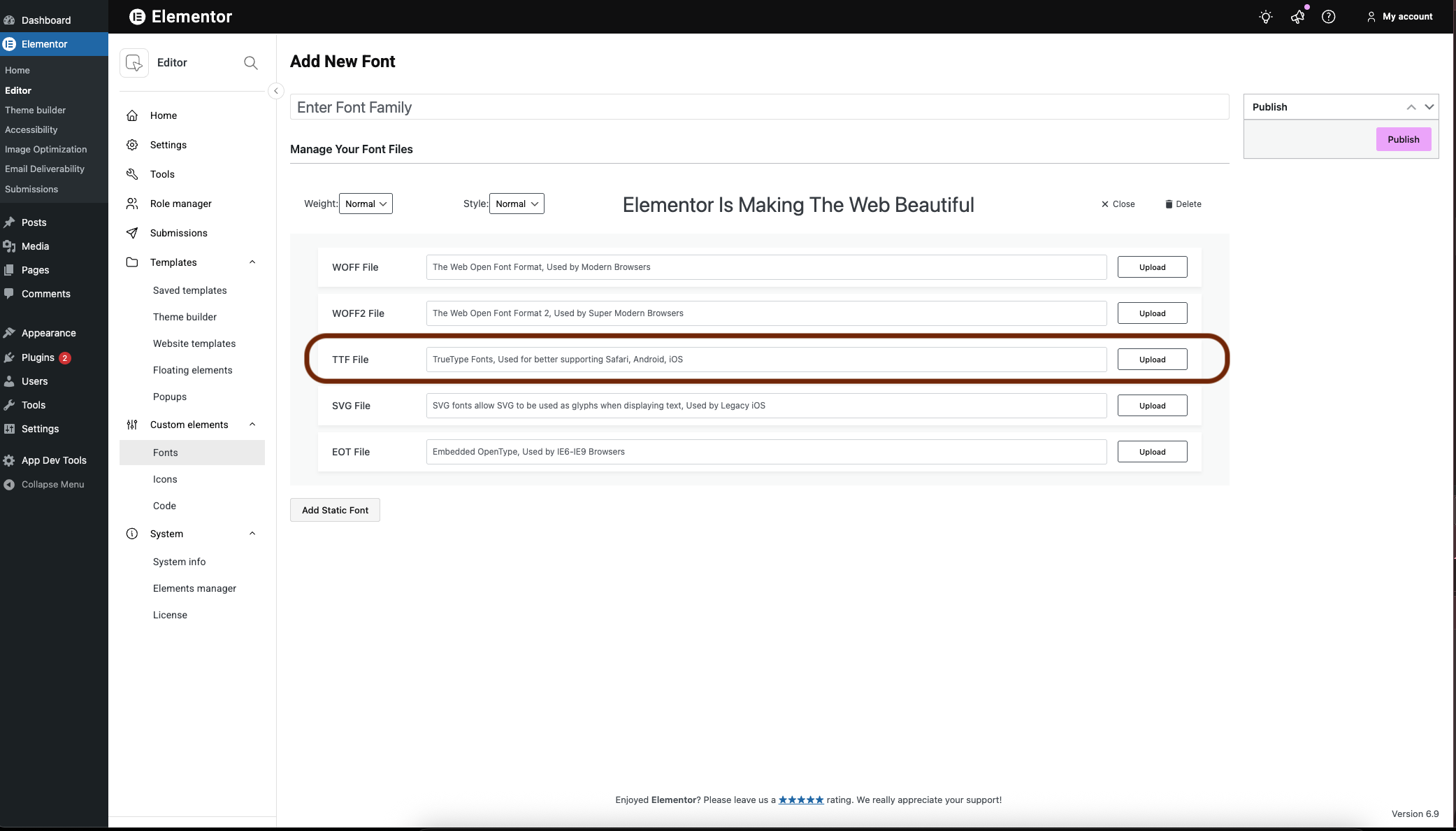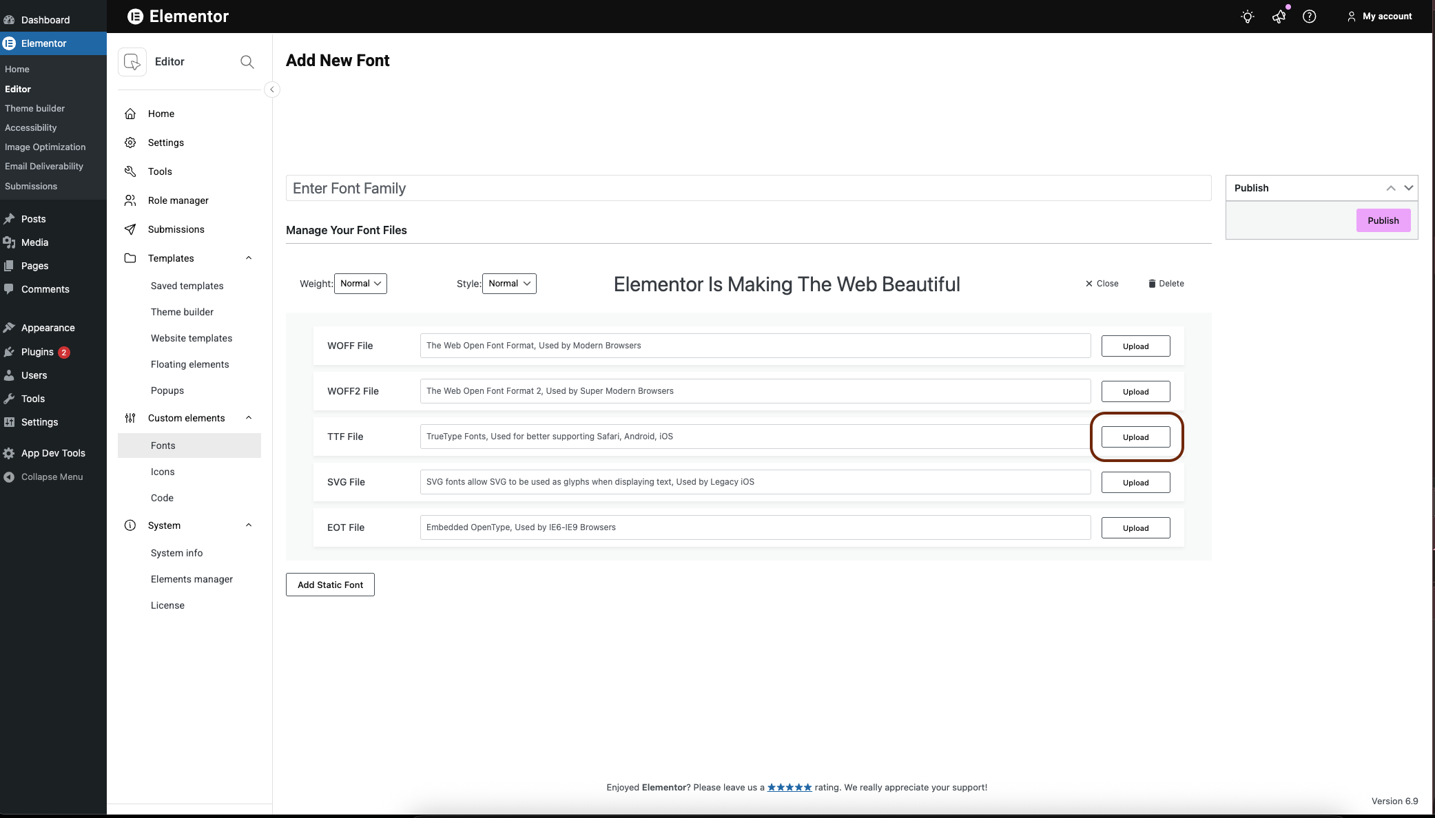 - Choose the font type you want to install. See below the font types supported by Elementor. In this example, we’ll use a ttf file.