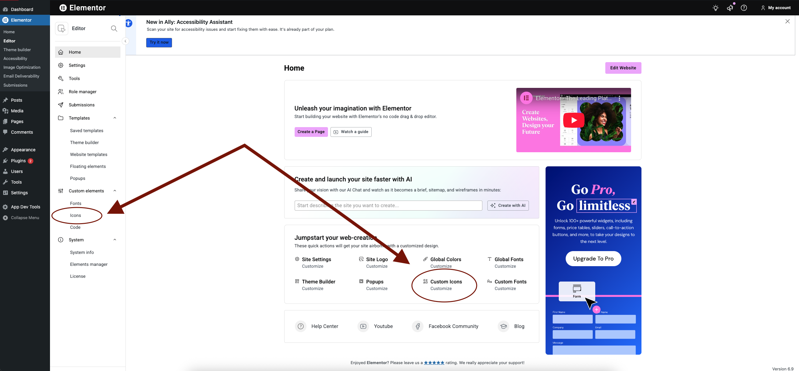 - In the ‘Jumpstart your web-creation‘ section, click “Customize” under Custom Icons.