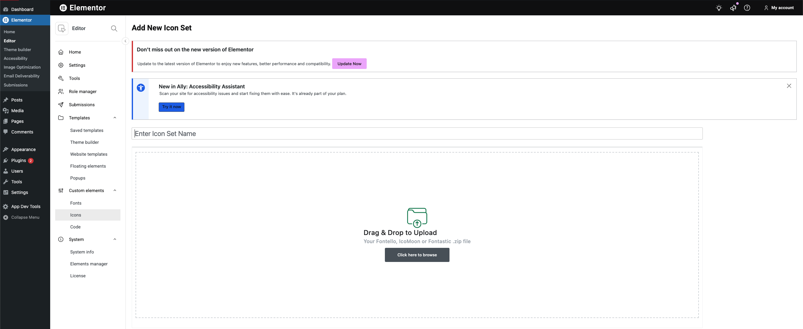 Upload your own custom icons to your website using Elementor Pro’s Custom Icons feature. You can use Fontello, Icomoon, or Fontastic for the job.