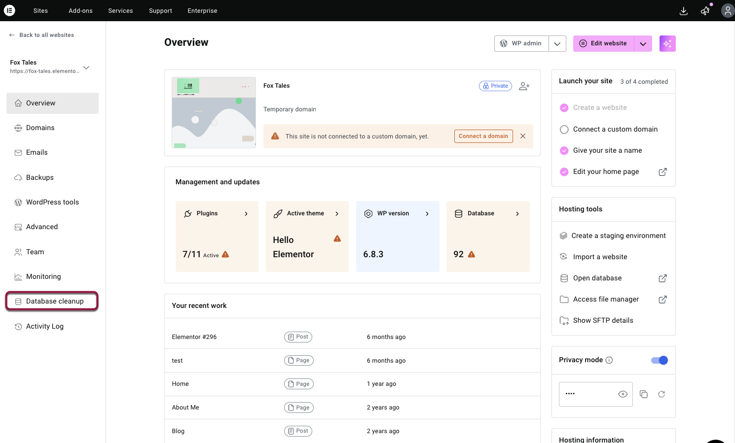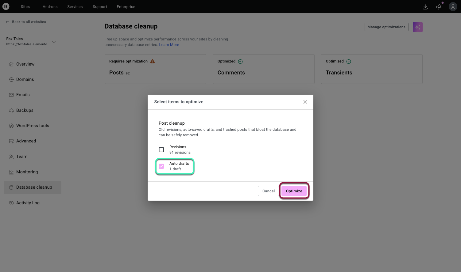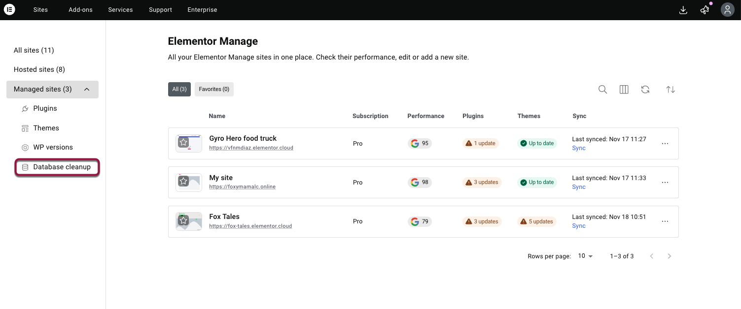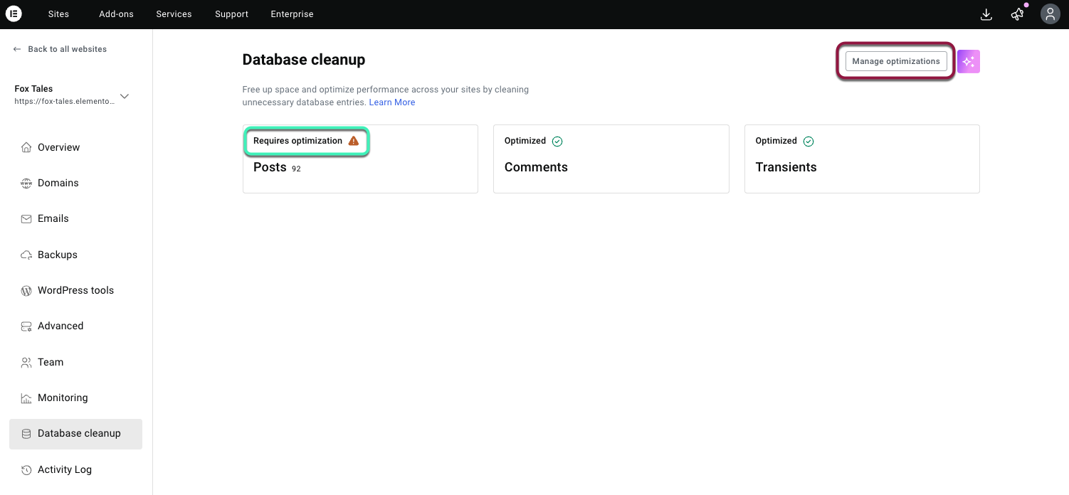 Over time, WordPress databases collect unnecessary data such as post revisions, auto drafts, trashed posts, spam comments, and expired transients. These items take up space, slow down your site’s performance, and can increase the time needed for backups or restores. Elementor Manage makes it easy to clean up this clutter and keep your sites running smoothly.