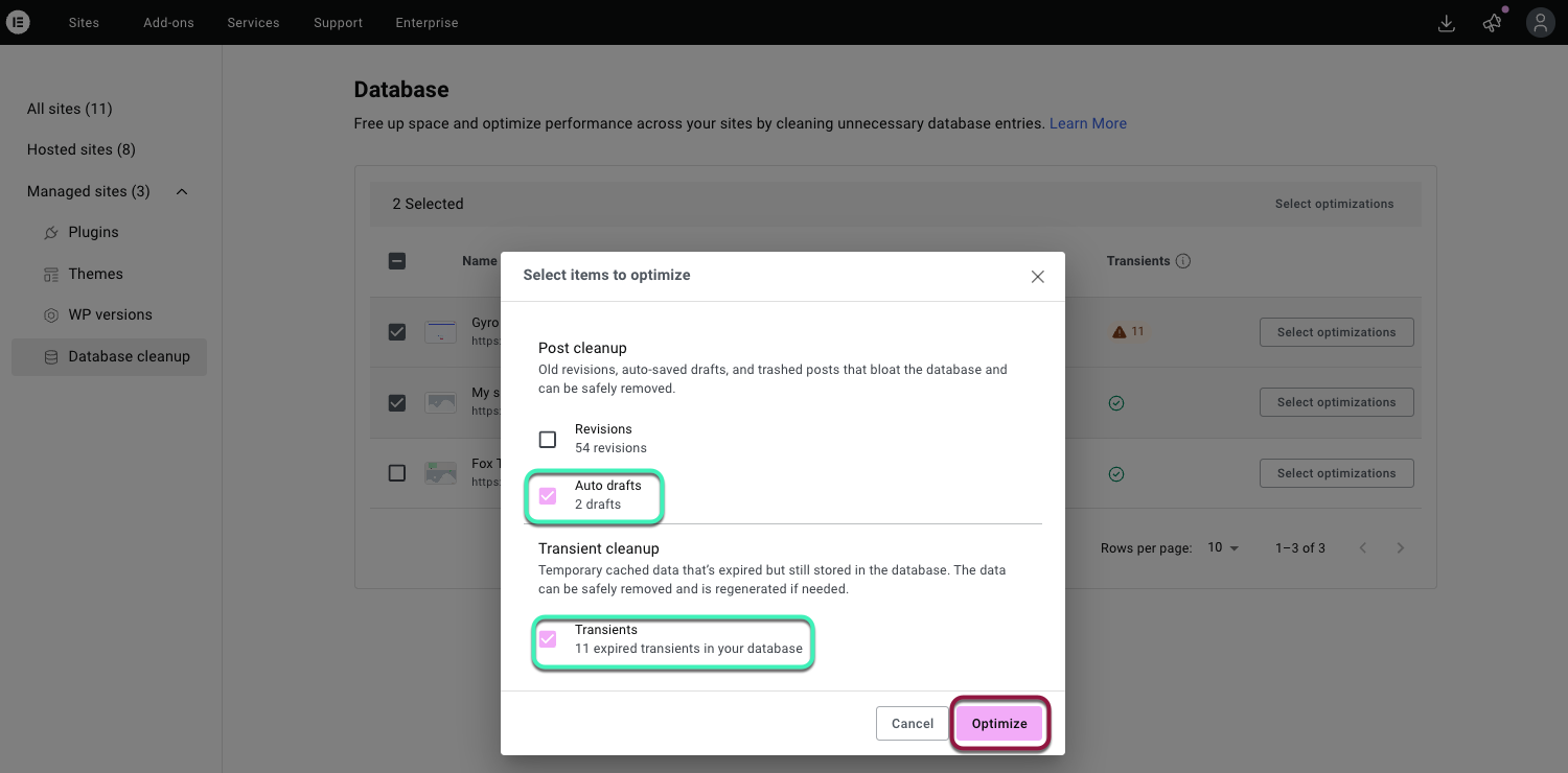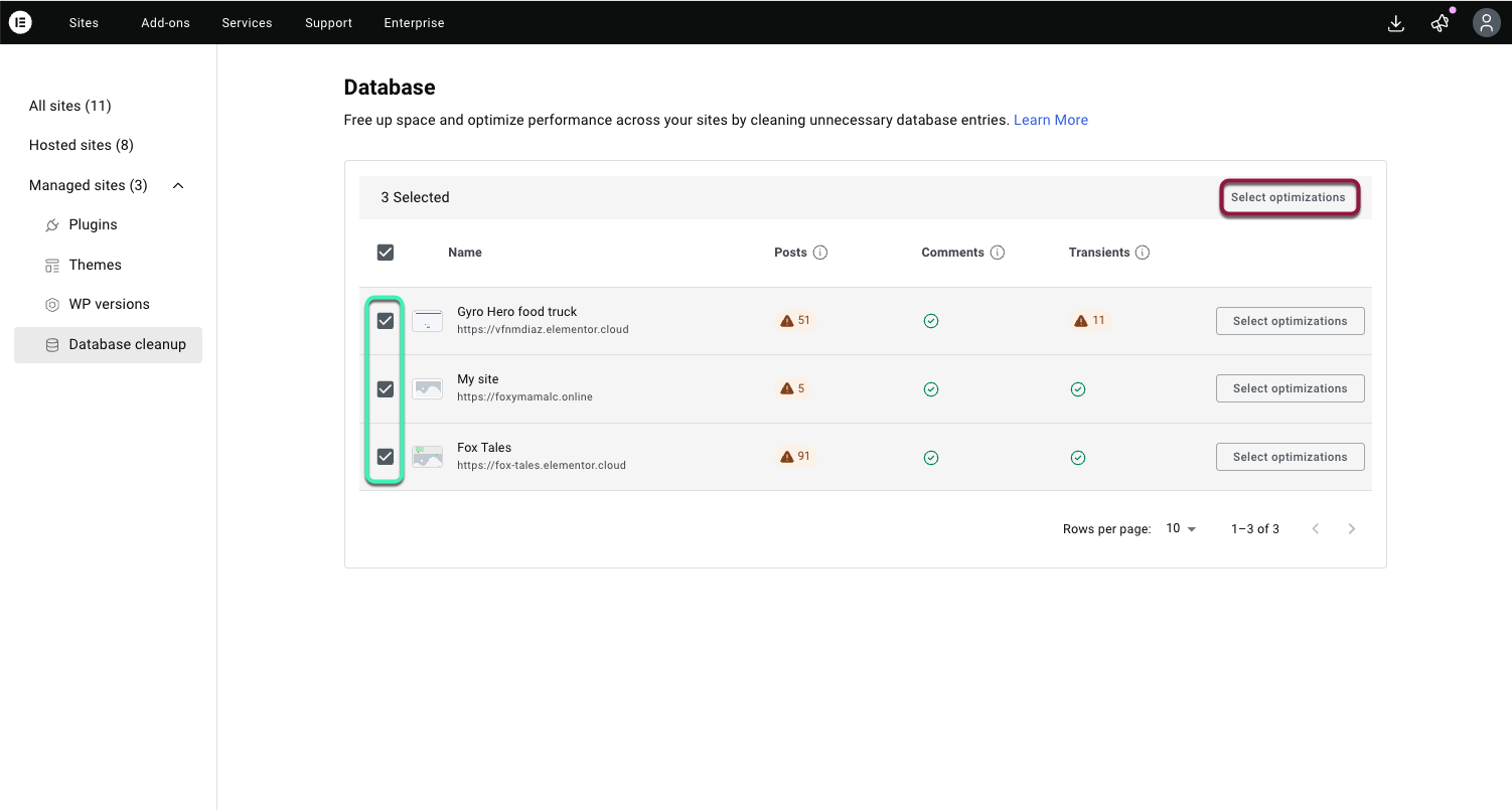 - Check the box next to the websites to select all the optimizations for those sites, then click Select optimizations.