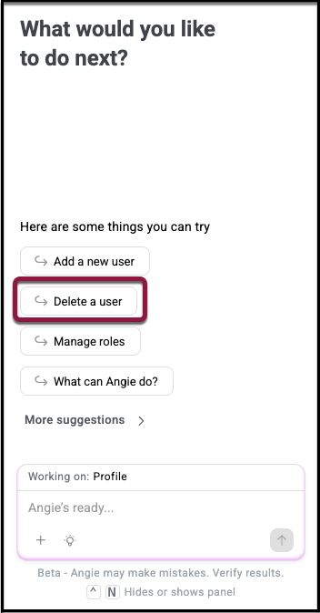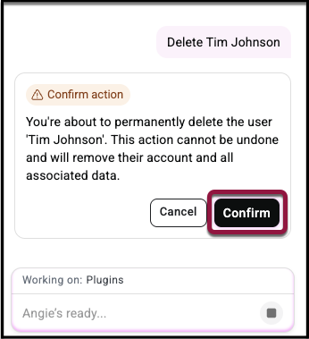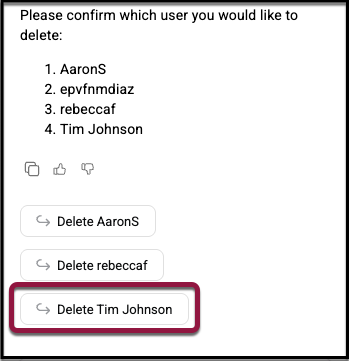 3. If you don’t specify which user, Angie will ask you to select the user you want to delete. Click the user’s name to delete them, or type their name into the prompt box.