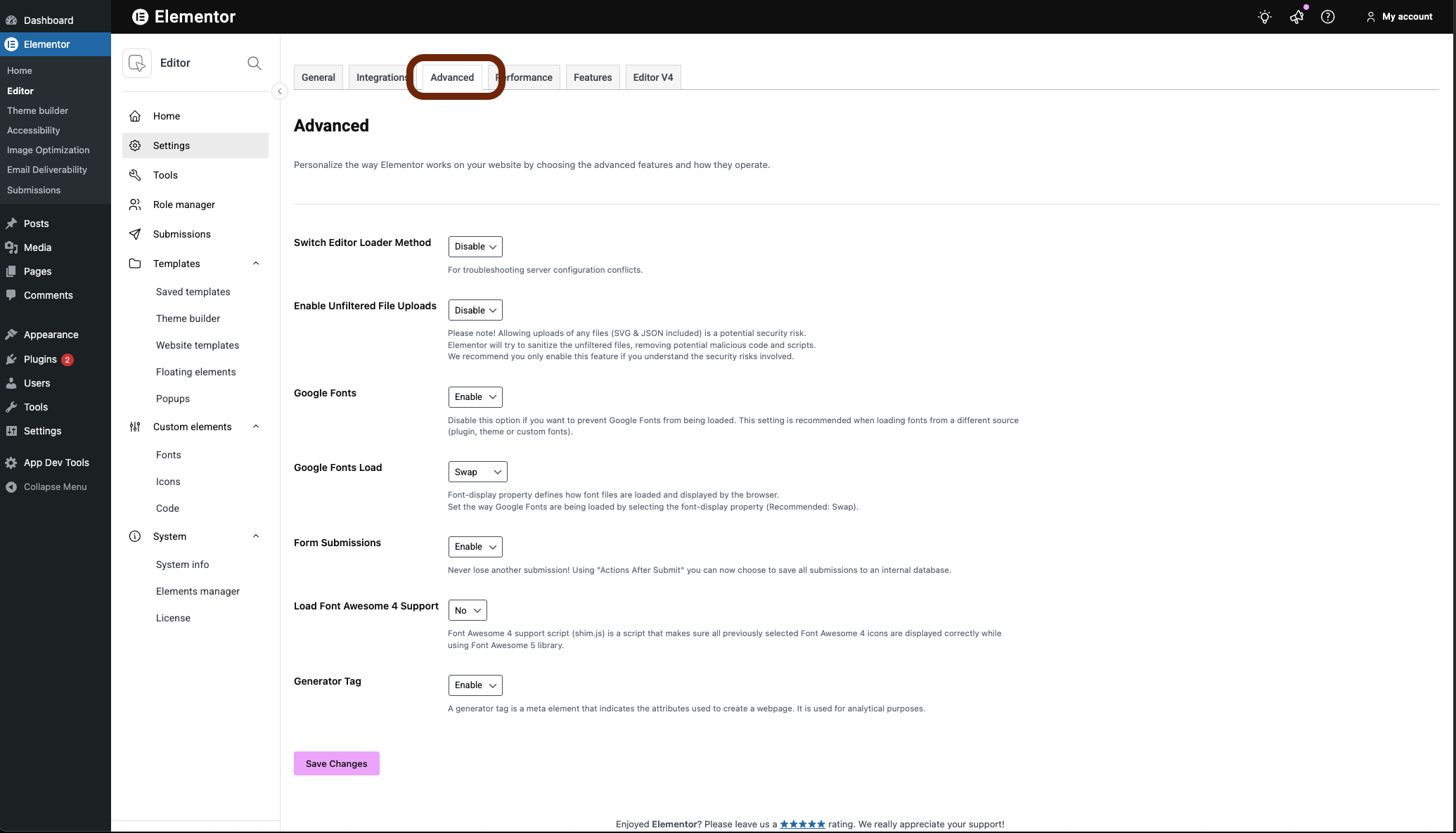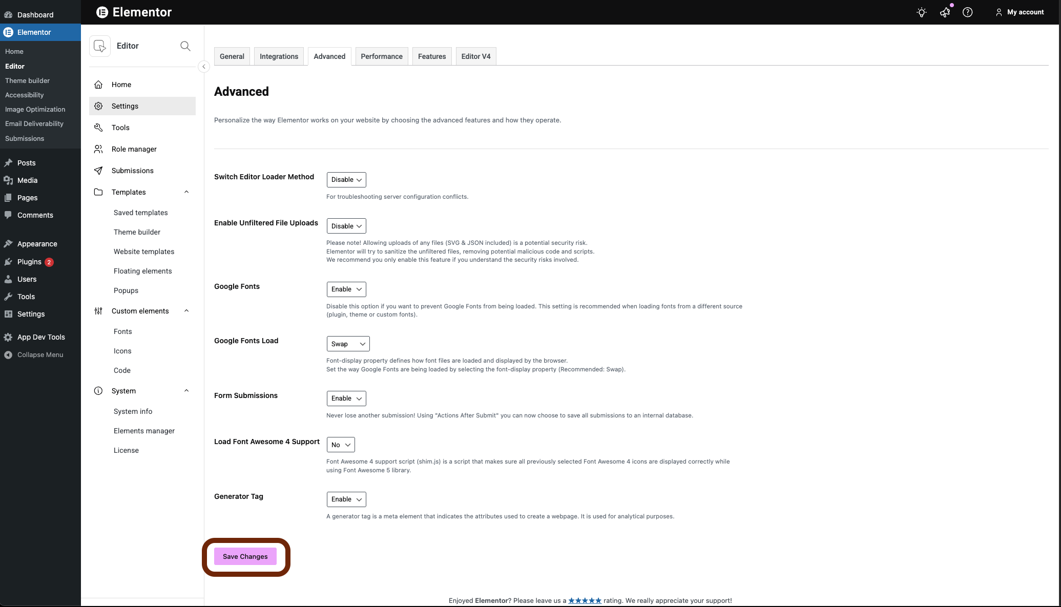 - From WP Admin, navigate to Elementor>Editor>Settings.