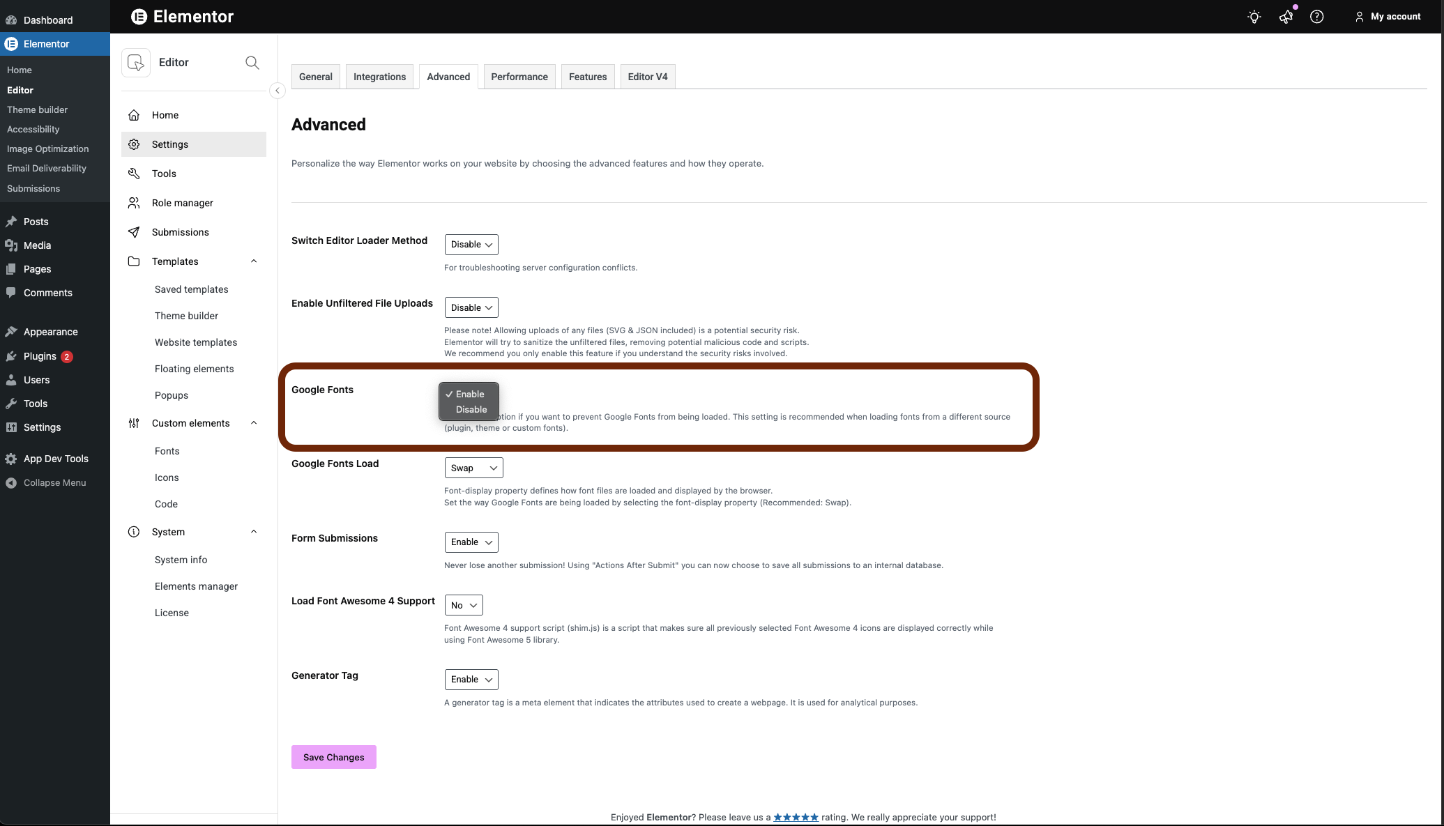 - In the pane, from the Google Fonts dropdown menu, select Disable.