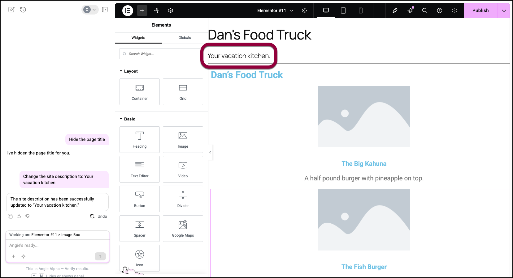 The site description is the default text which we should change. - In the Angie panel enter the prompt: