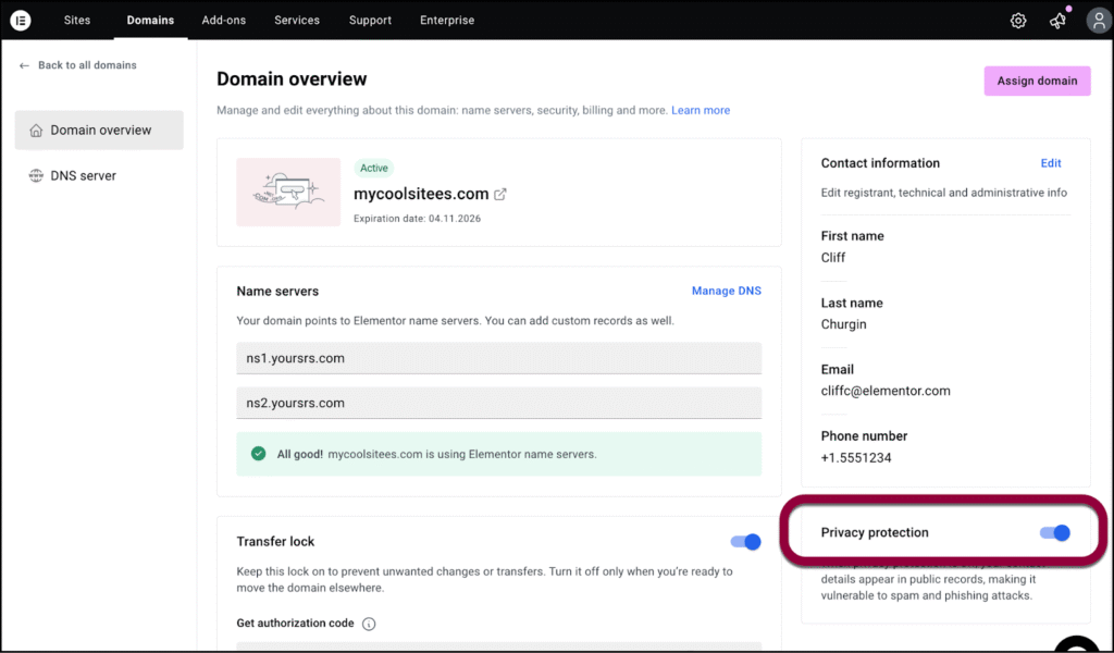 When you purchase a domain name ICANN regulations require that you provide personal information such as your name, address, phone number and email address. Exposing this information to the public can leave you vulnerable to scammers and phishing emails. By default, when you purchase a domain from Elementor, this information is proxied. However, you can disable this privacy protection.