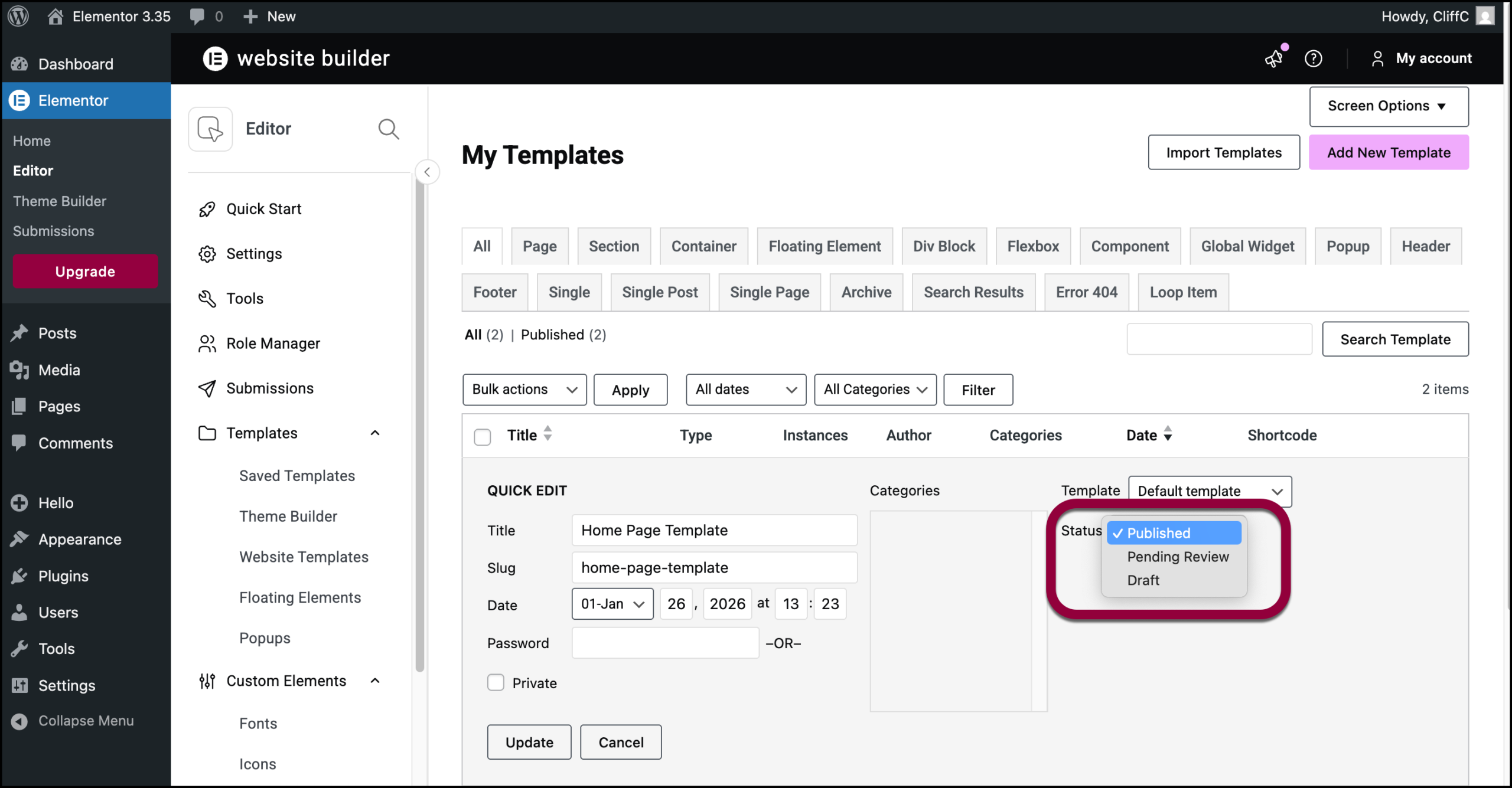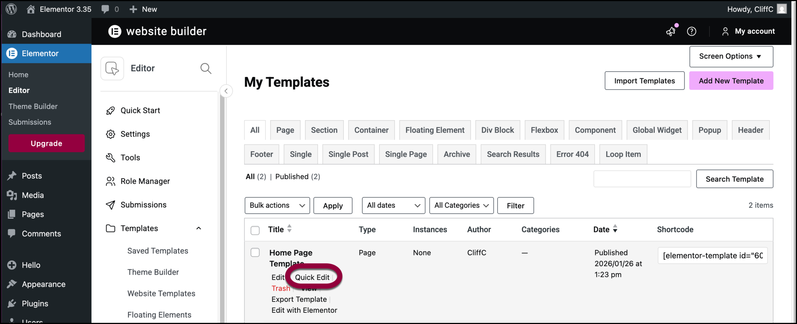 From WP Admin, navigate to Elementor>Editor>Templates.