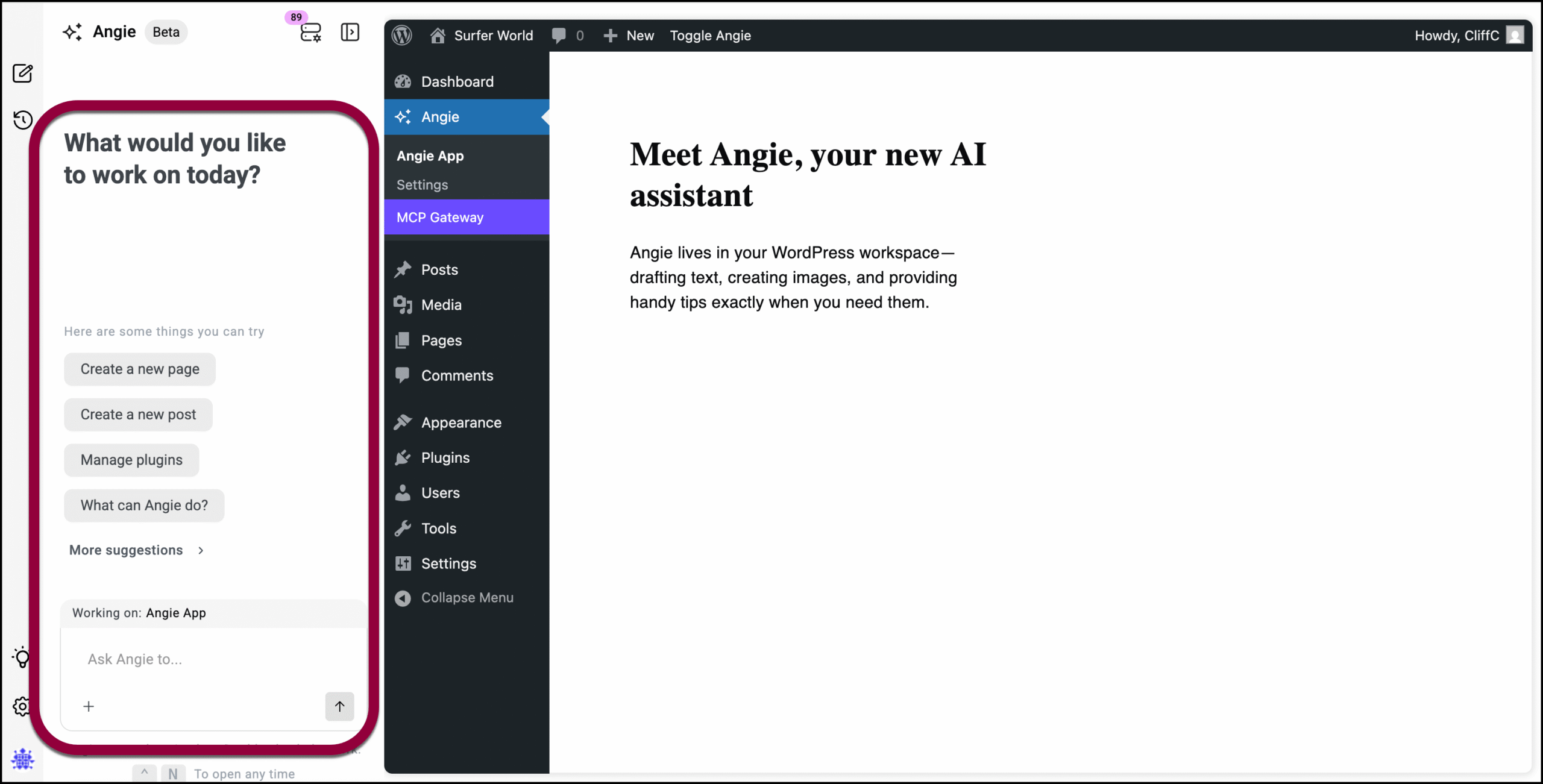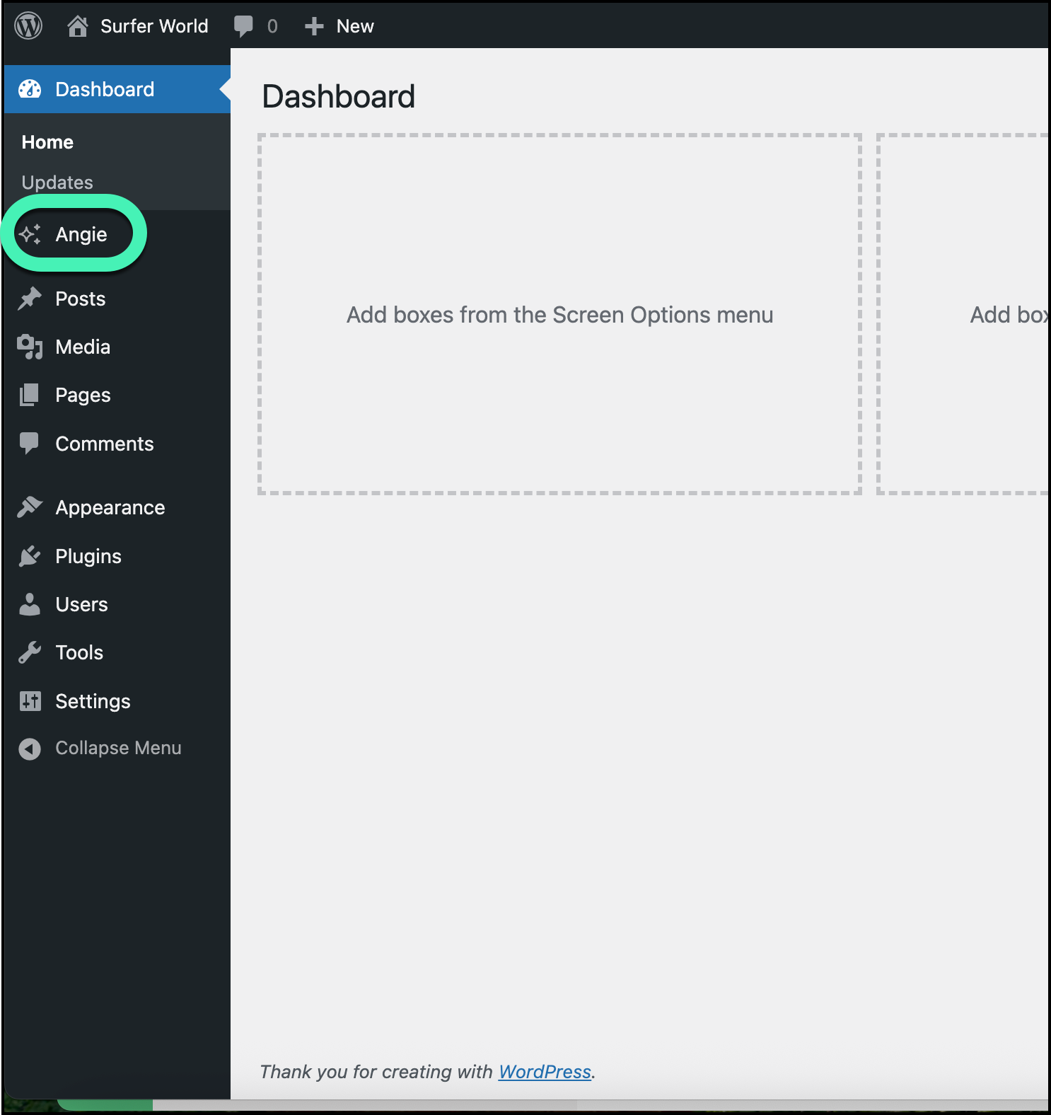 - Click the Angie option that now appears in your WP Admin panel.
