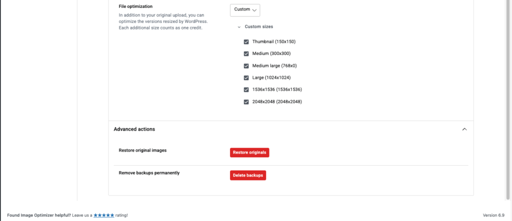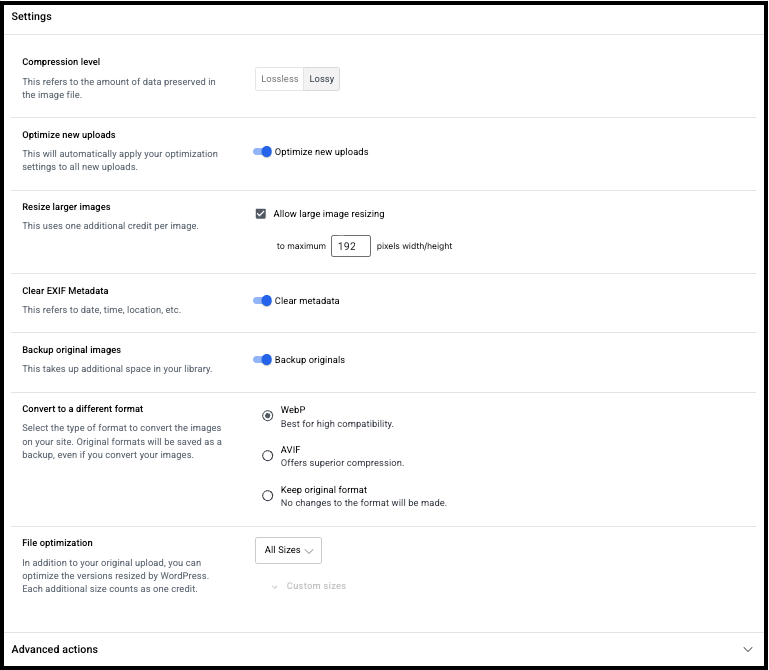 - File Optimization: WordPress automatically generates multiple image sizes for every upload. This setting lets you choose which sizes to optimize. Since each size uses a credit, consider disabling any sizes you don’t need.