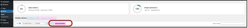 In the left sidebar, you’ll see a “Bulk Optimization” option. This allows you to optimize all existing images in your library at once, showing:​