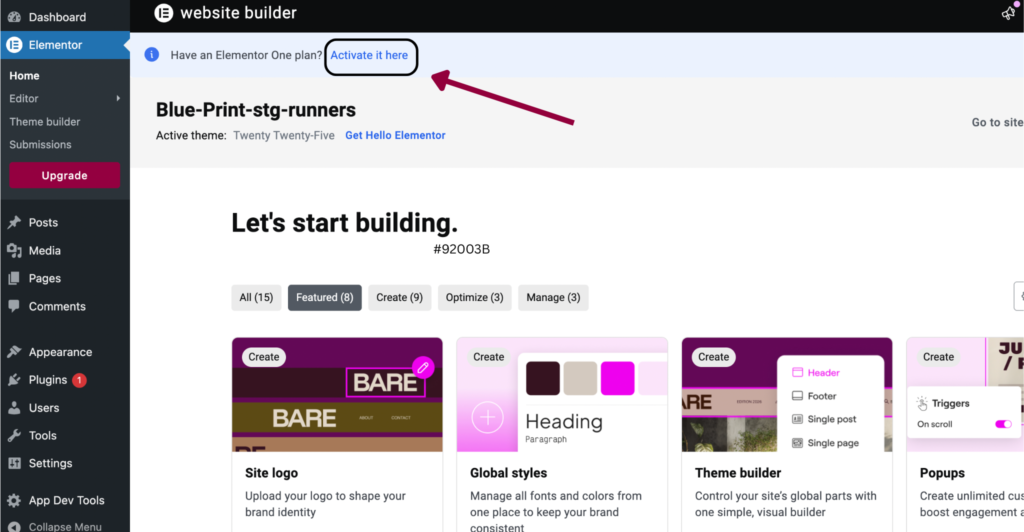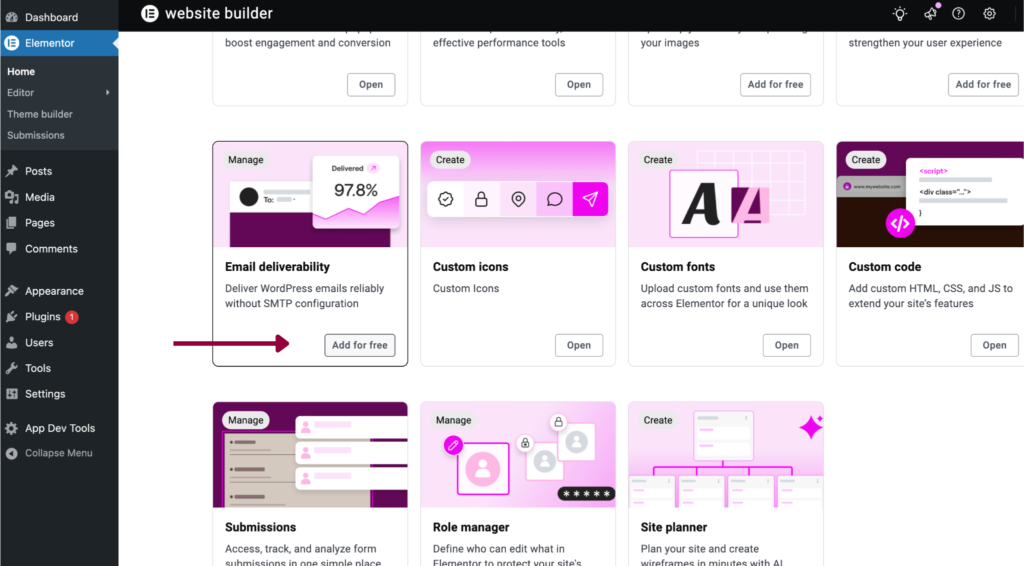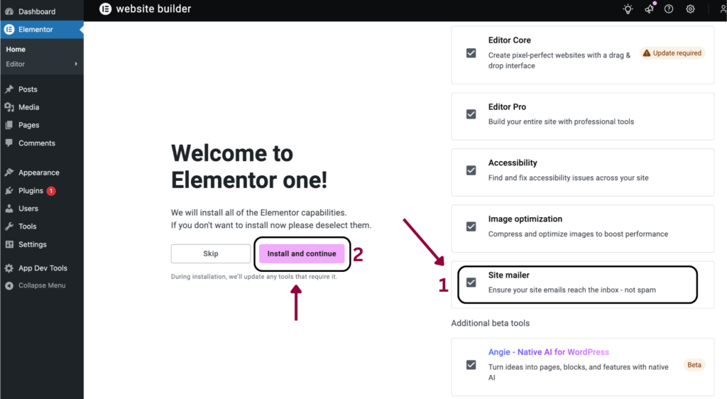 Option 1 to get Email deliverability – install it through the setup of Elementor One: