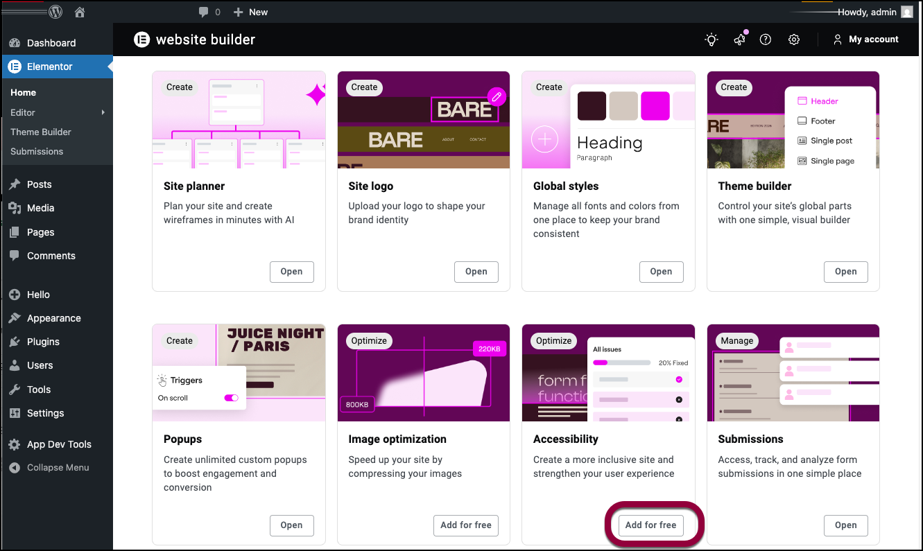 - After installing Elementor One, you can install accessibility from Elementor>Home.