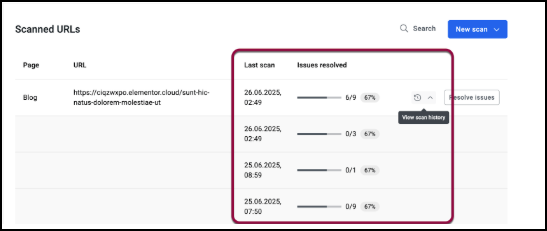 - היסטוריית סריקות: תצוגה של 10 הסריקות האחרונות לכל URL, כולל היסטוריית התיקונים עבור כל URL.