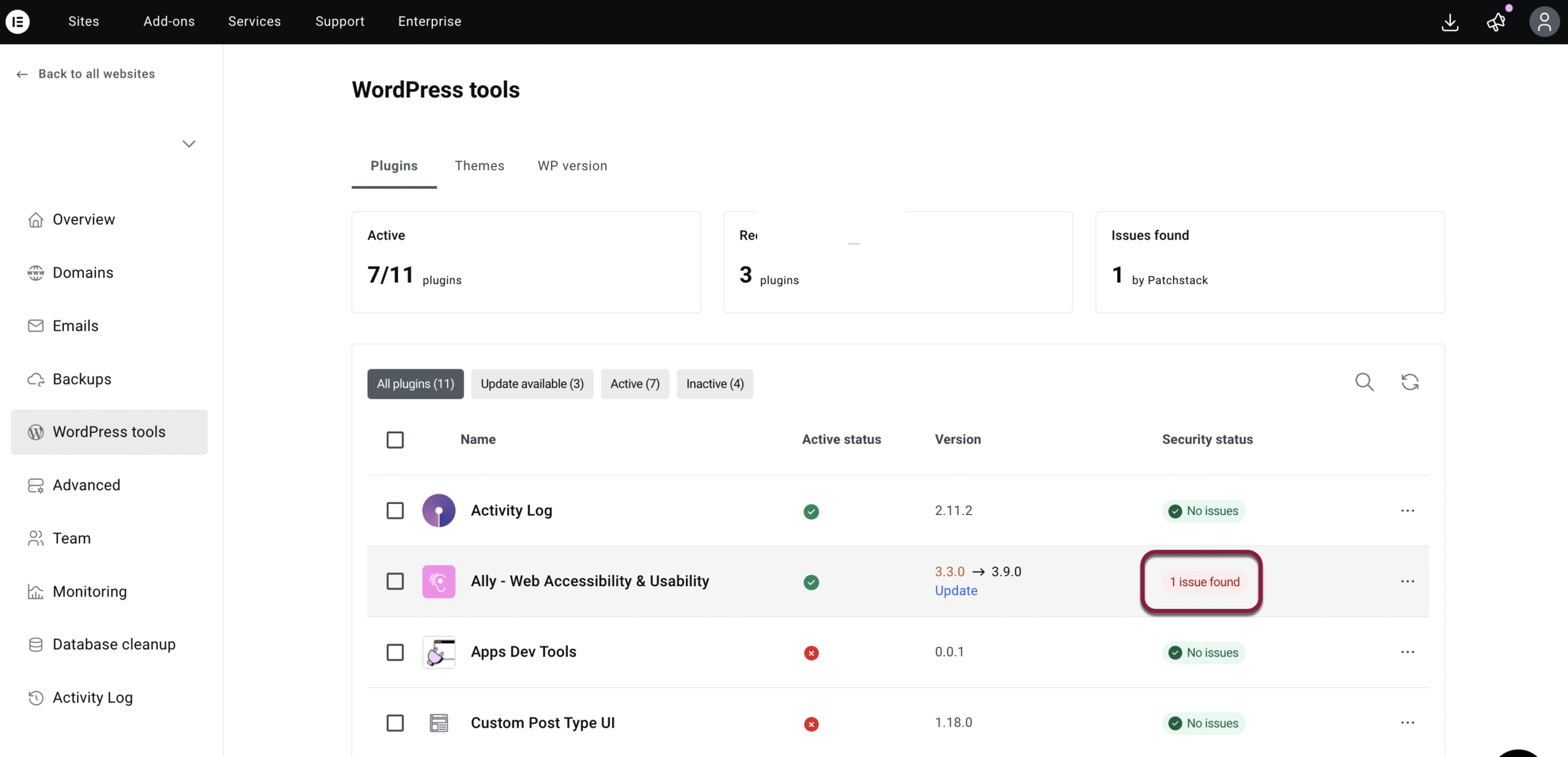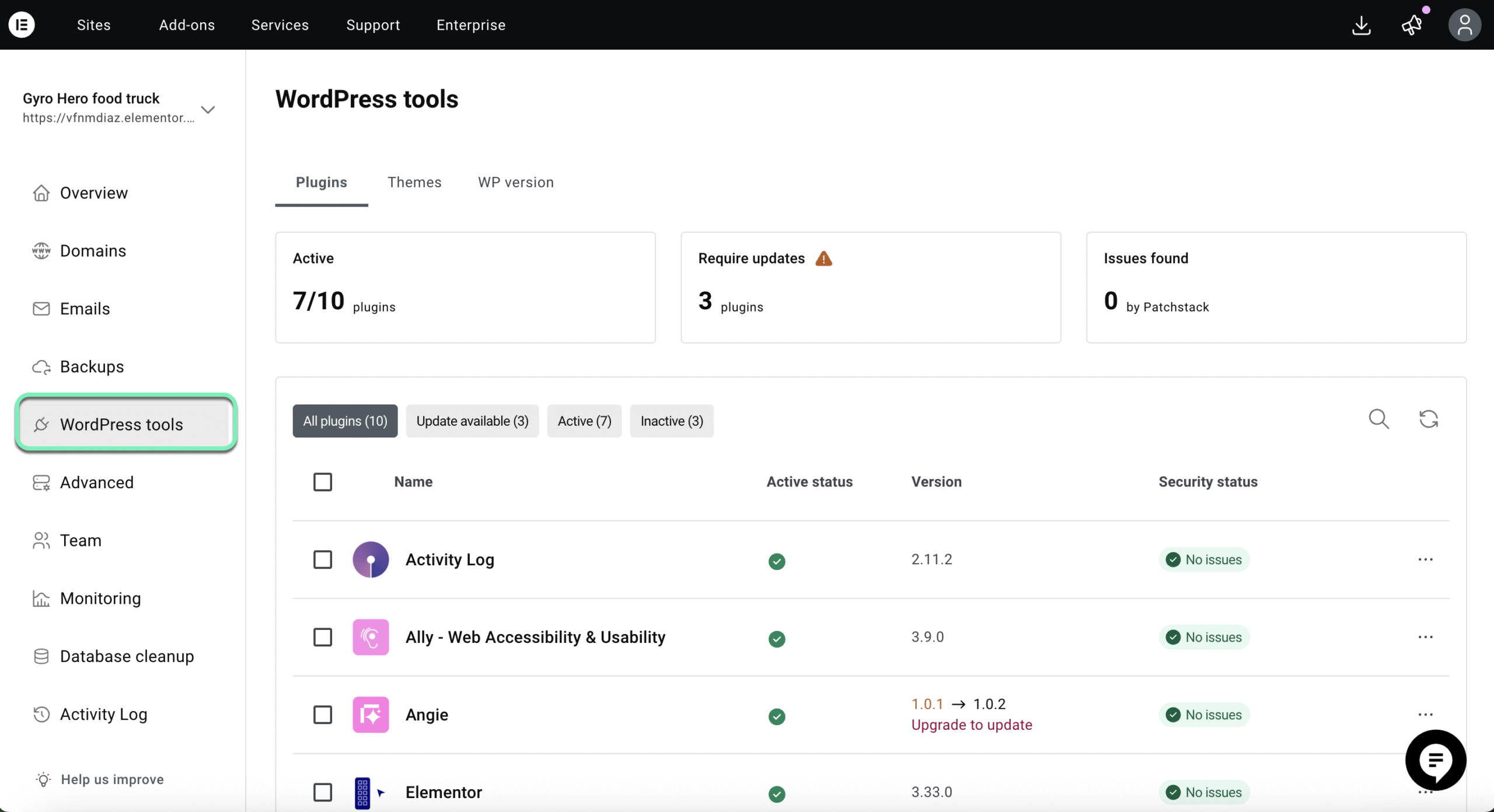 The Patchstack integration is built directly into the Plugin Management view of Elementor Manage, both for individual sites and for managing multiple sites at scale.