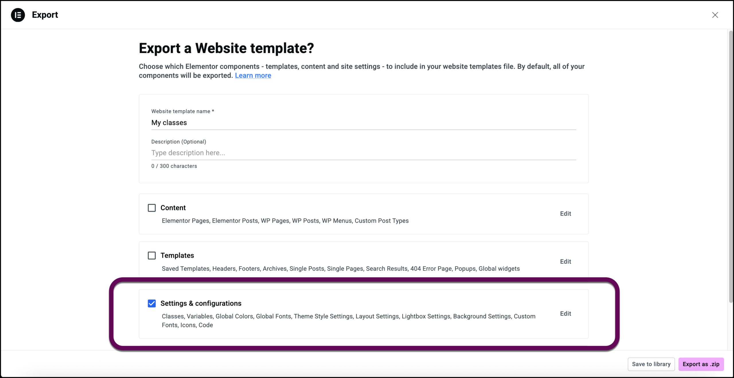 9. Click Save to library to save the classes and variables to the template library or Export as zip to create a file that can be imported into another site.