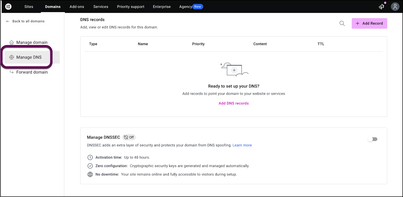 DNSSEC (Domain Name System Security Extensions) adds a layer of security to your domain to prevent DNS spoofing and hijacking. In Elementor, you can enable this feature by navigating to the Manage DNS tab. If using Elementor Name Servers, the setup is automatic; for external providers, you must manually enter the DNSKEY data.