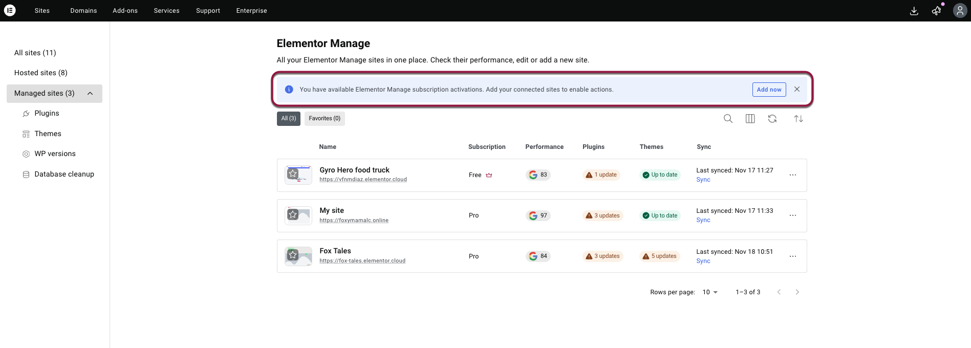 Once activated, All Elementor Manage features will be unlocked for those sites using your subscription.