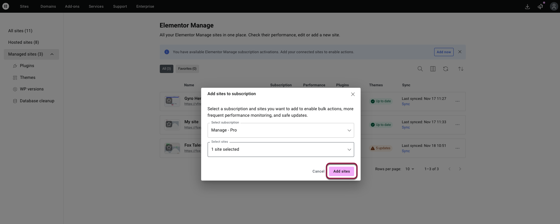 If you already have sites connected, you can activate them under your Elementor Manage subscription.