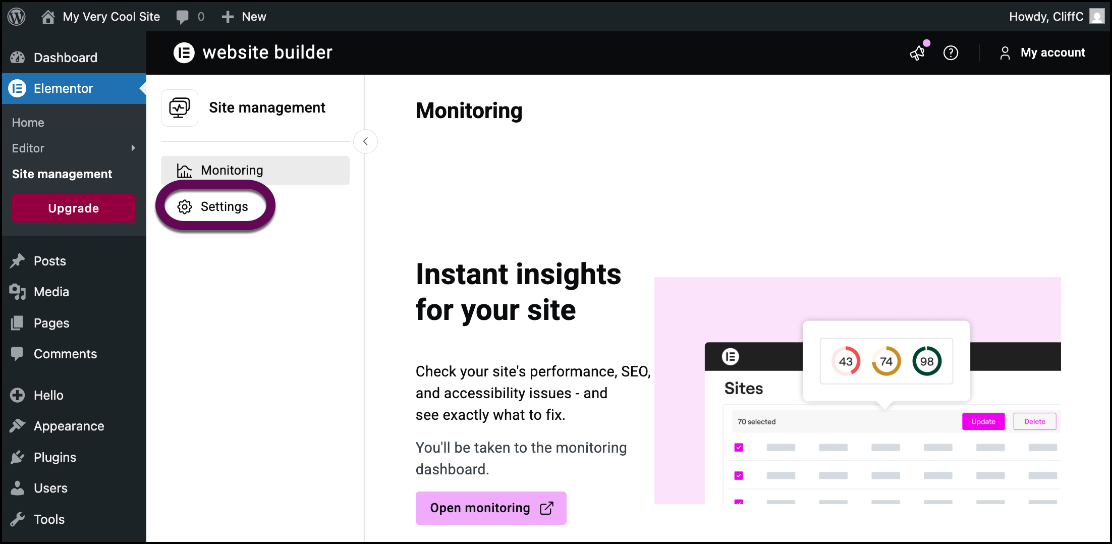 To install Manage, you can use the WordPress repository, the My Elementor dashboard, or include it in an Elementor One subscription. Once the Manage plugin is installed on your site, click “Connect to start” to link it to your Elementor account. This process authenticates your website and unlocks remote management features.