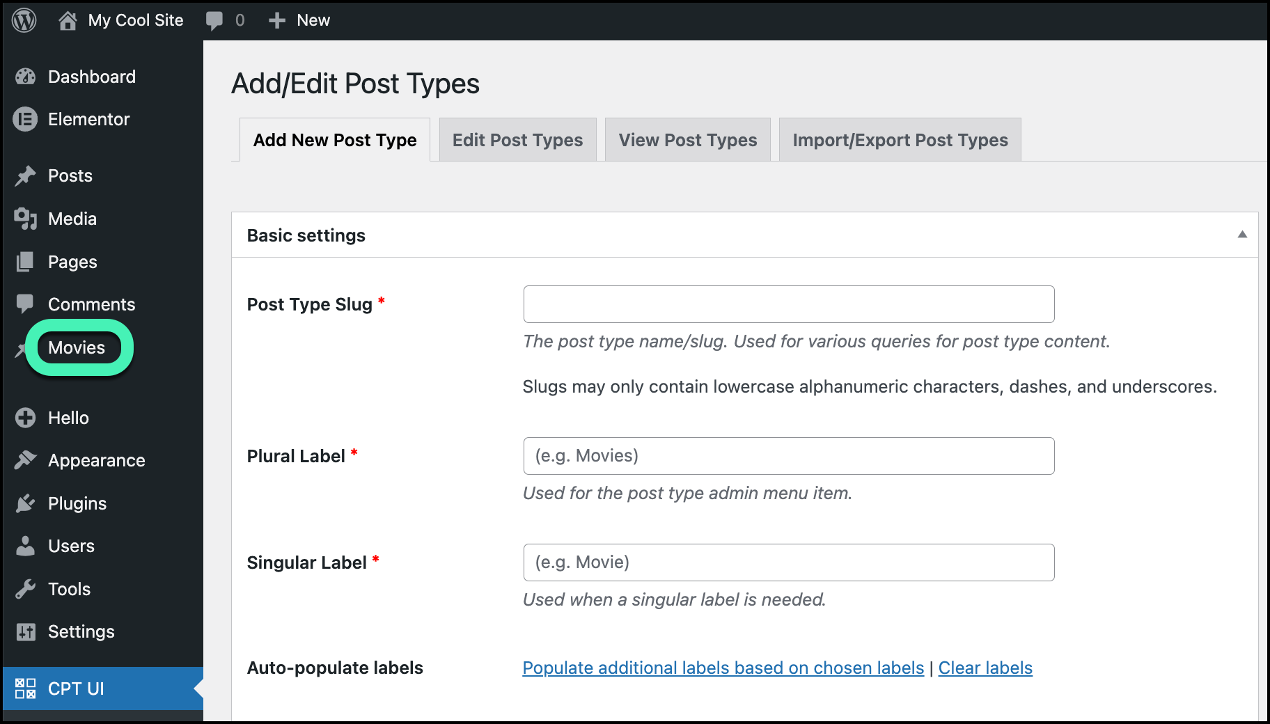 - In the Post type slug field, enter movie.