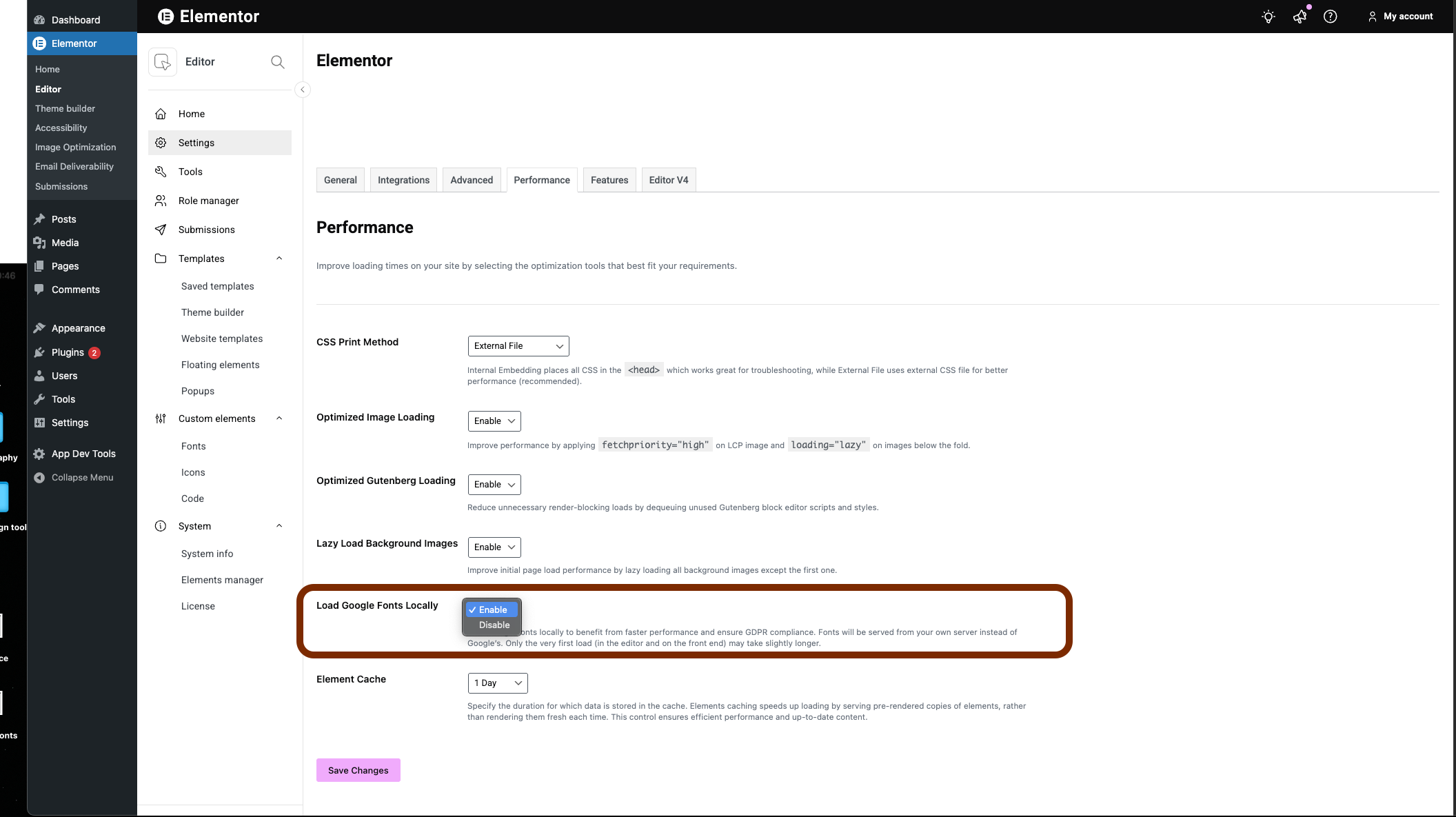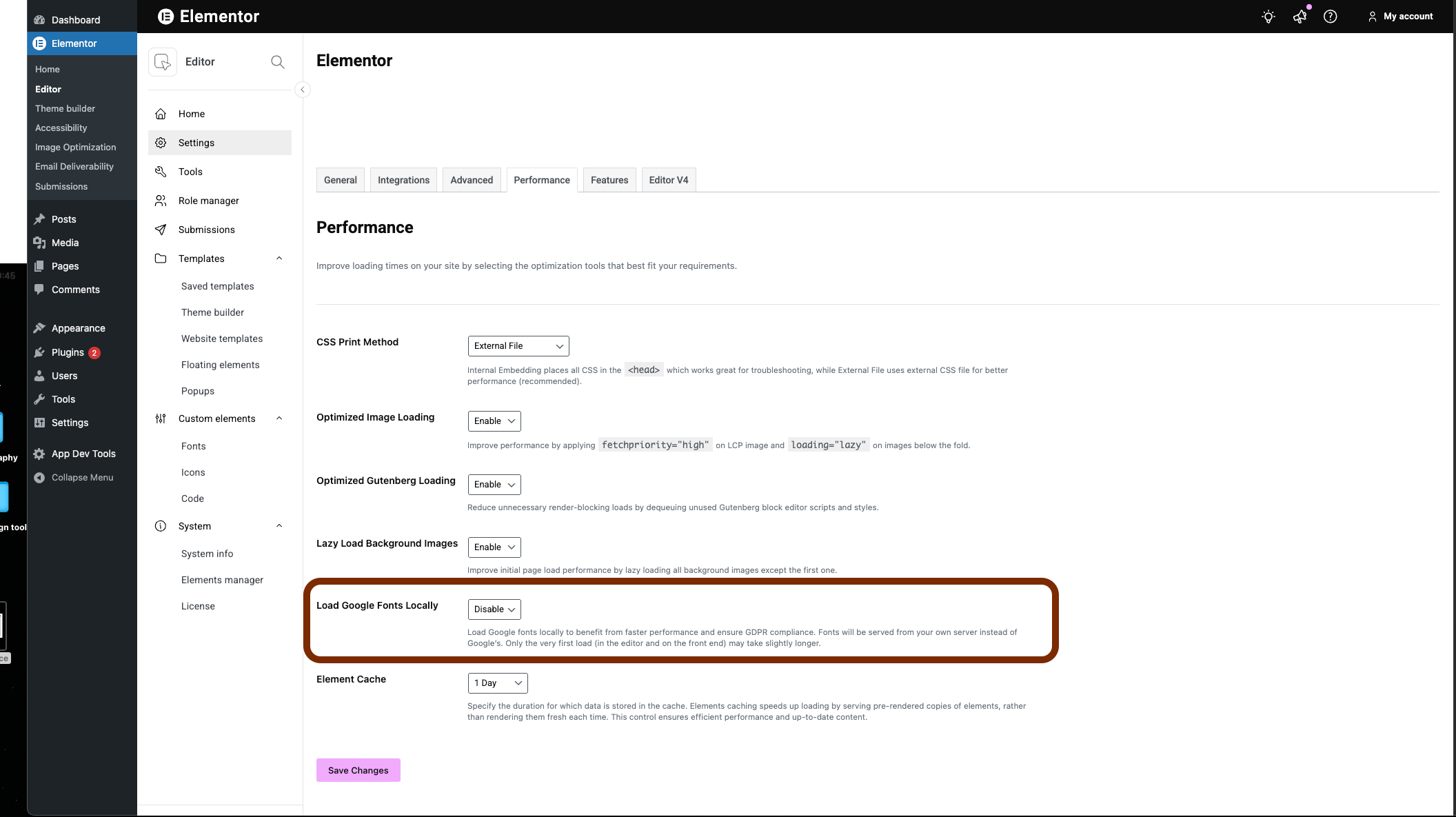 To address these issues, Elementor allows you to Load Google Fonts Locally, which lets your site serve fonts directly from your own server instead of Google’s CDN.