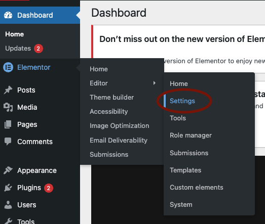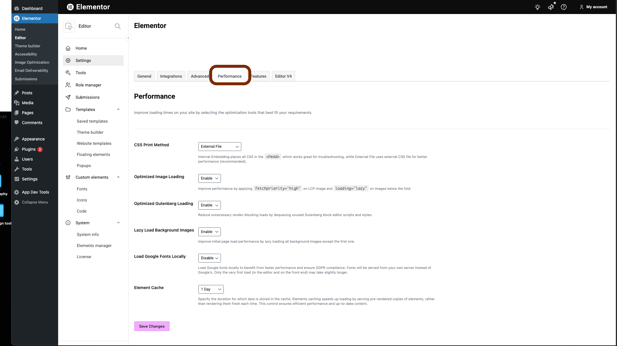 2. Navigate to Elementor > Editor>Settings and click the Performance tab.