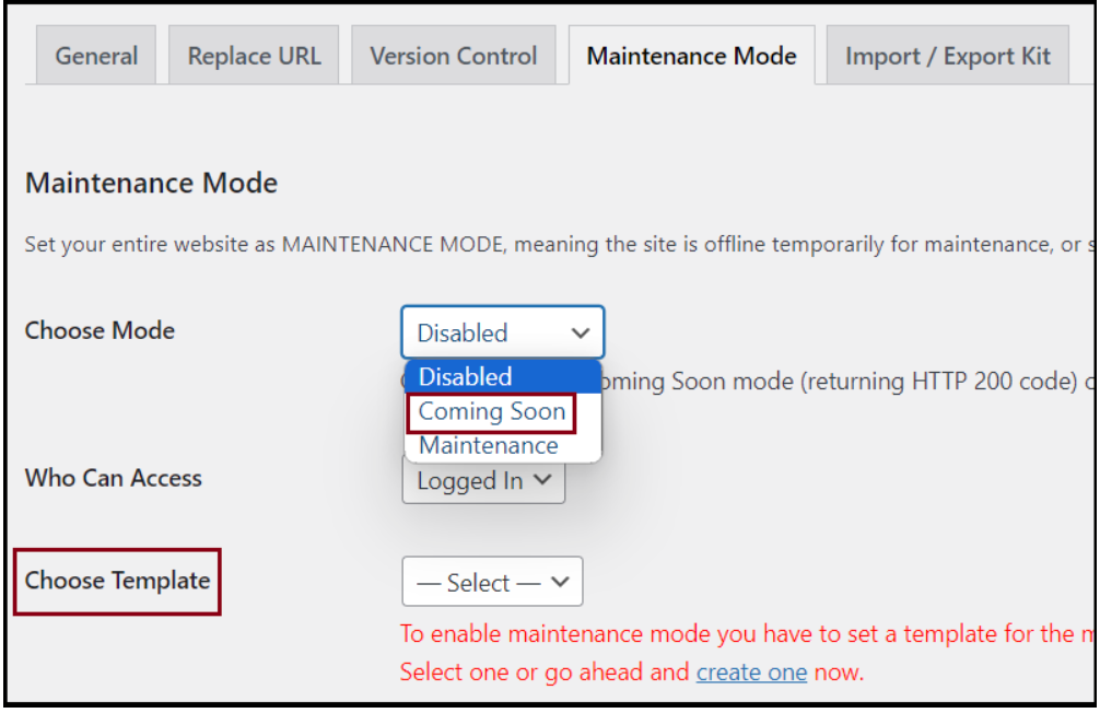 - Choose Maintenance if your live website is taken down for update and maintenance.