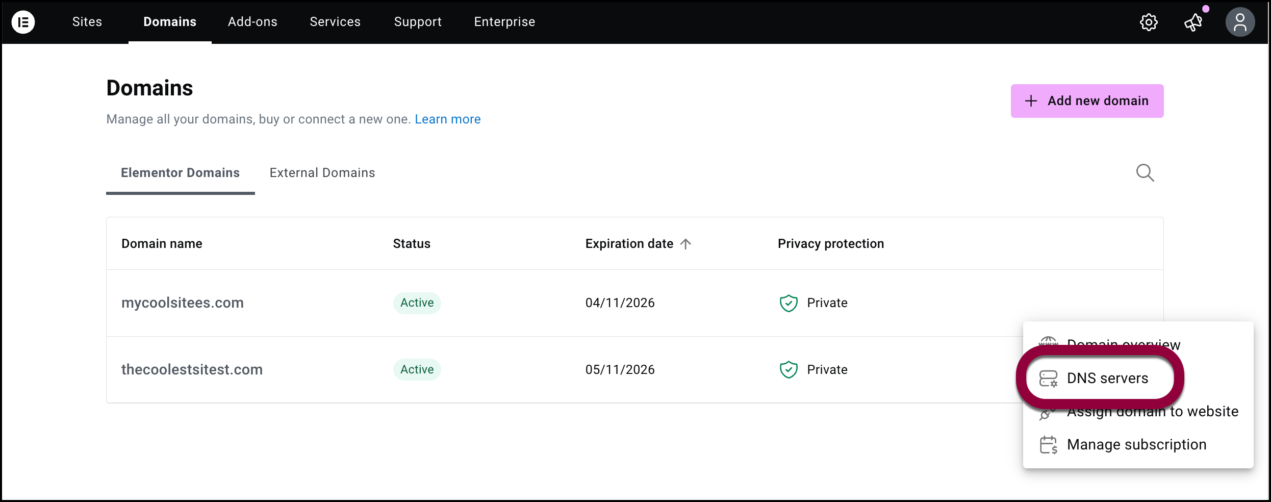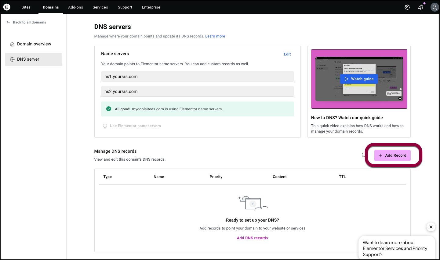 The DNS servers screen appears. - Scroll down to the Manage DNS records section.