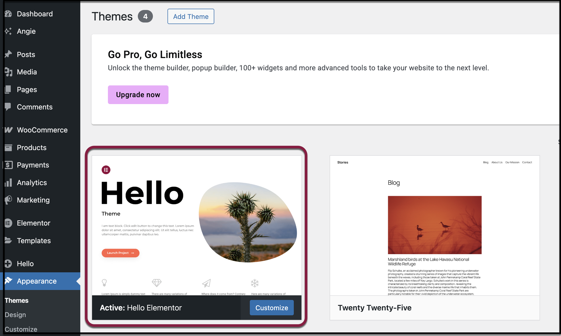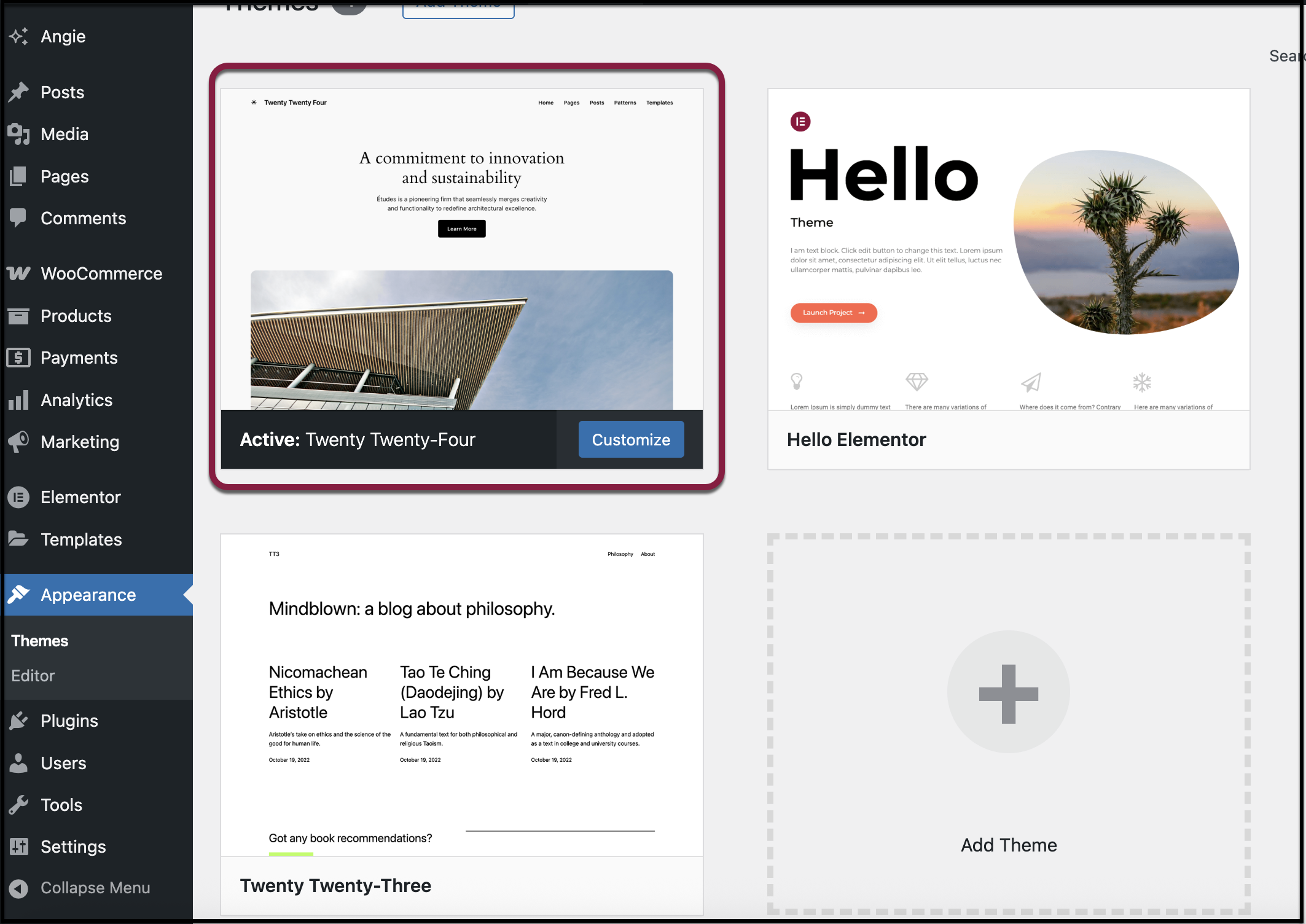 - Angie will confirm that the theme has been activated. Verify by going to WP Admin > Appearance > Themes, where the active theme will be marked.Tips