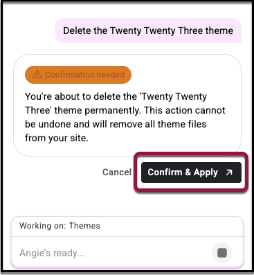 - Angie will ask you to confirm before deleting. Click Confirm and Apply.