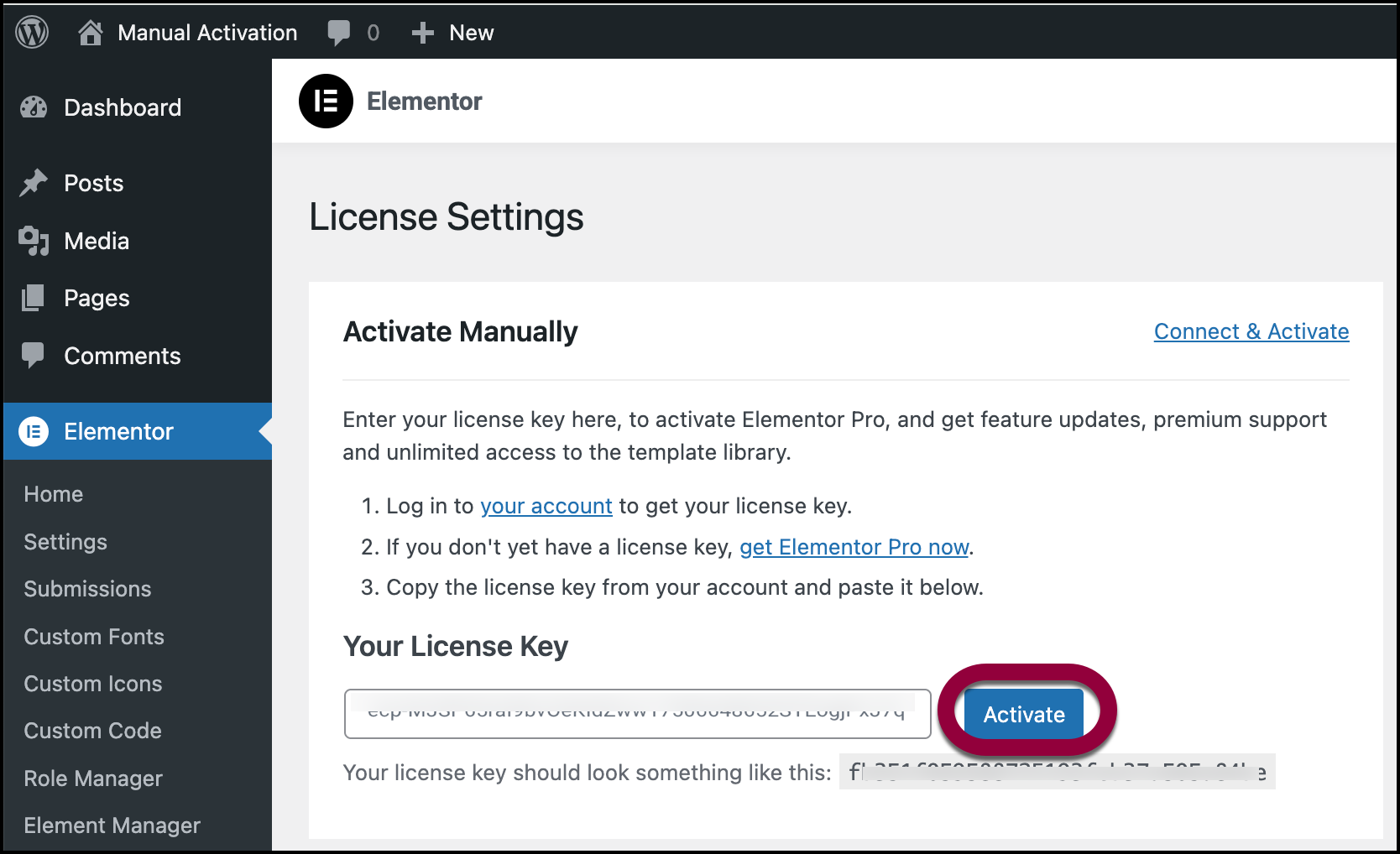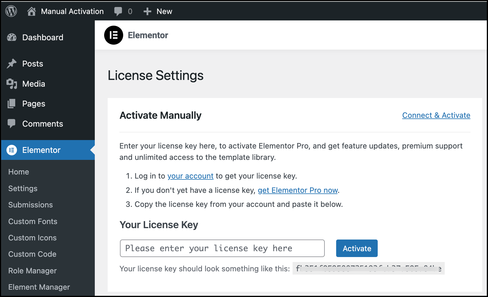 If the automated connection process fails, you can manually connect Elementor Pro to your account.