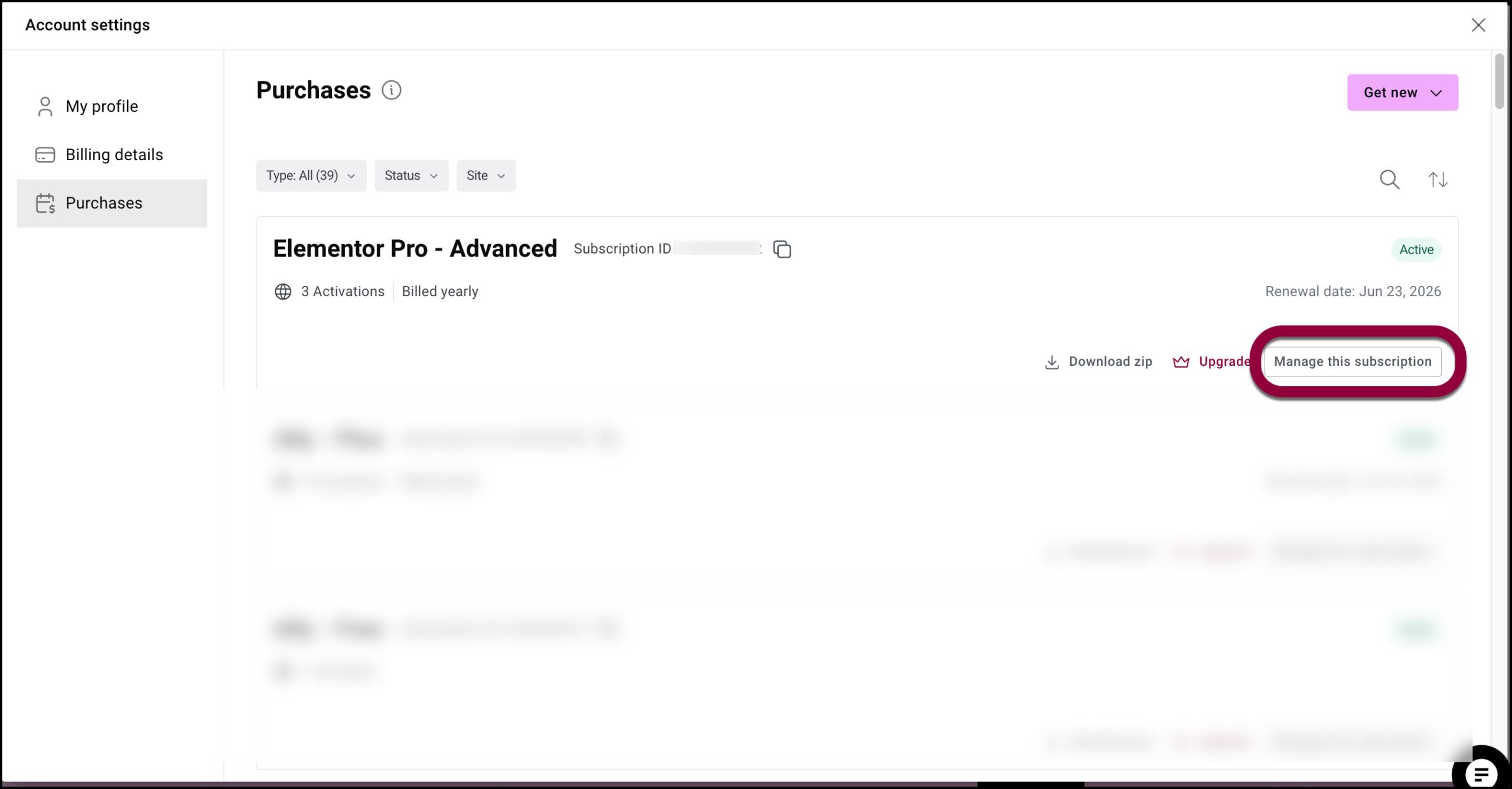 A list of your subscriptions appears. - Click Manage this subscription for the subscription associated with the license key.