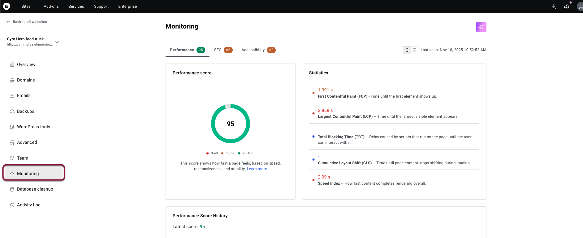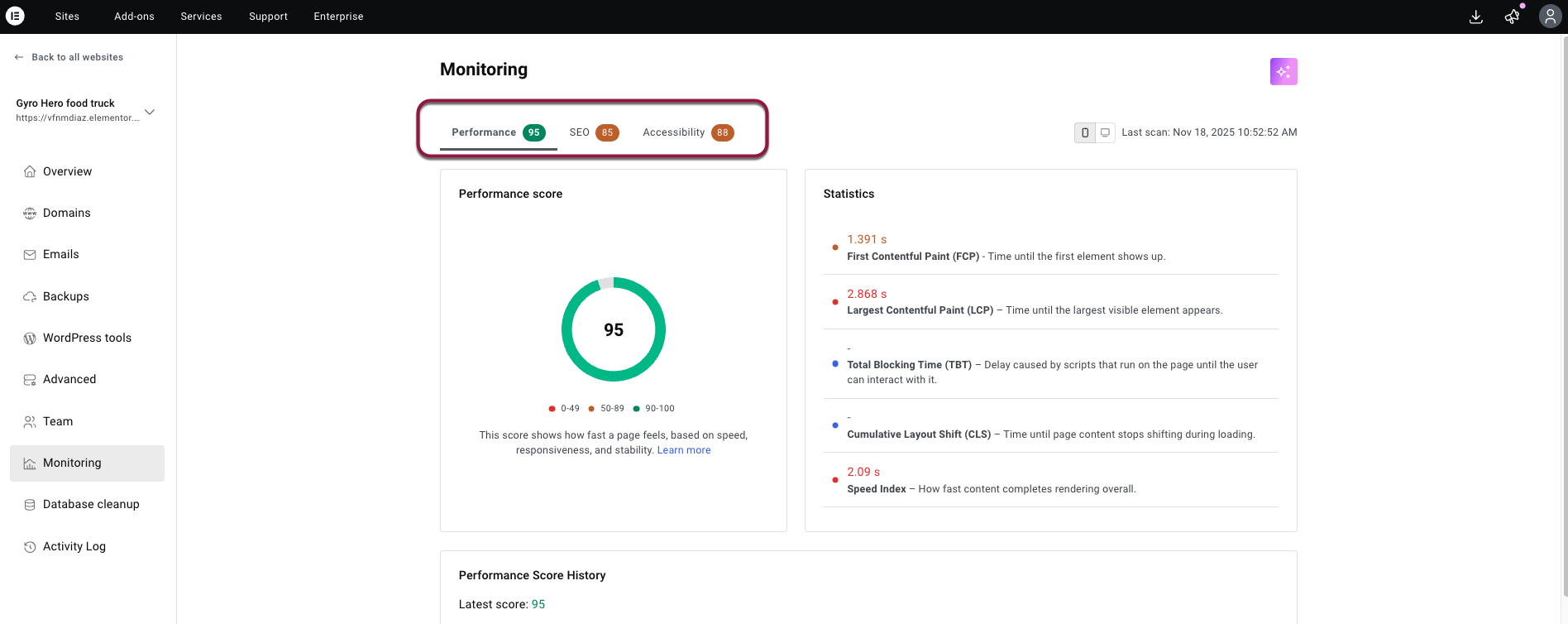 Monitoring gives in-depth insights for Performance, SEO, and Accessibility for your site in both Mobile and Desktop views.
