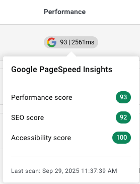 A colored indicator shows your site’s score for Performance, SEO, and Accessibility.