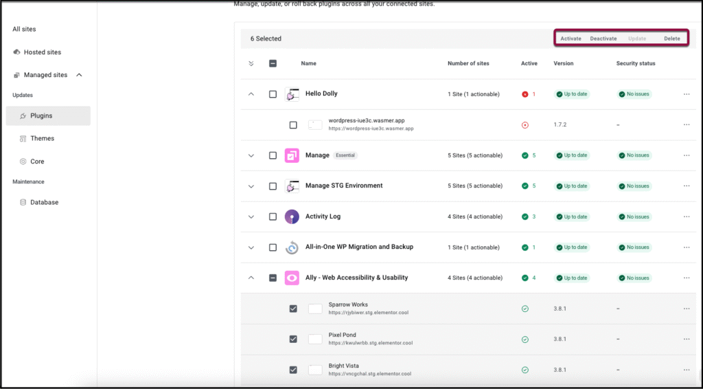 With Elementor Manage, you can perform Bulk actions for Plugins, Themes, and WordPress Versions.