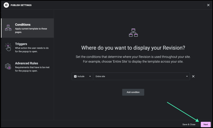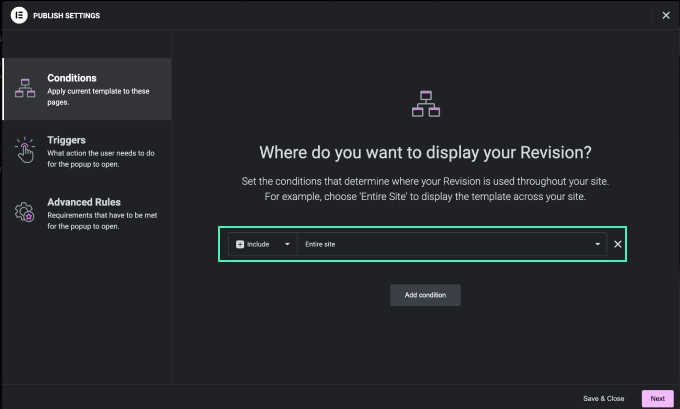 - Make sure the condition is set to Include Entire Site.