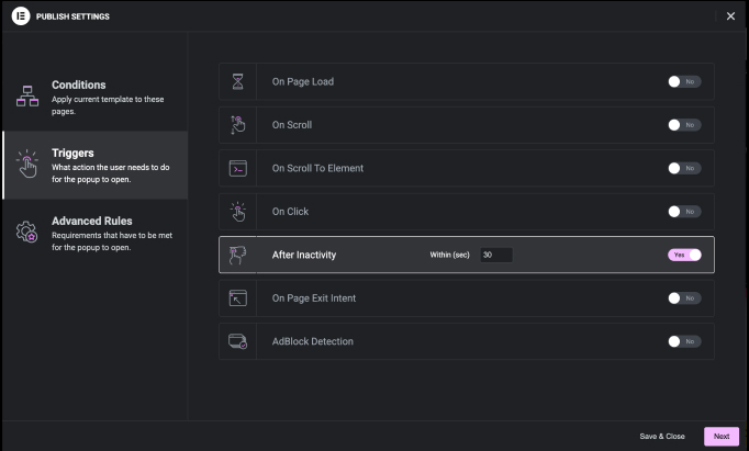 - In Triggers, select After Inactivity of 30 seconds and click Save & Close.