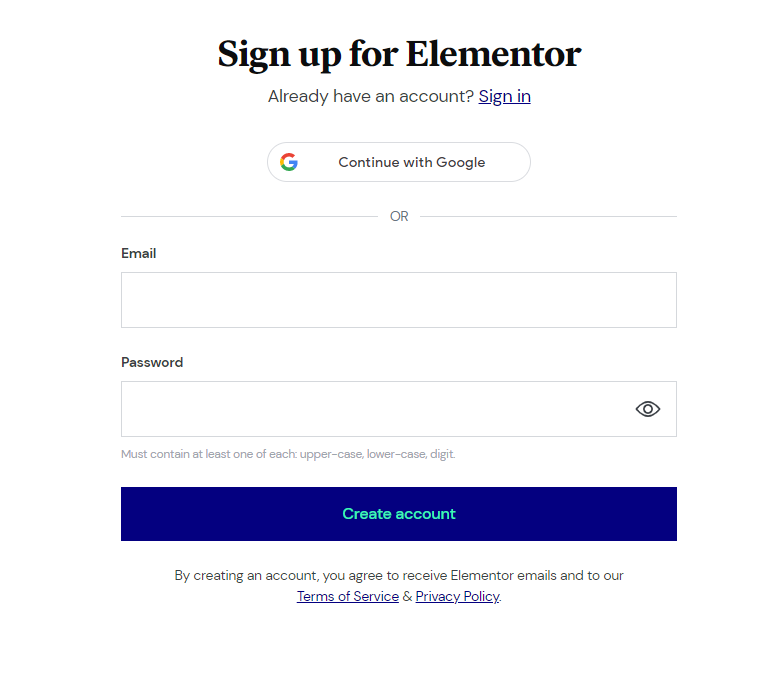 | Continue with your email | Create an account using your email address. You will then enter your email address, select a password and click Create account. In the future, use this email and password to login to Elementor. |